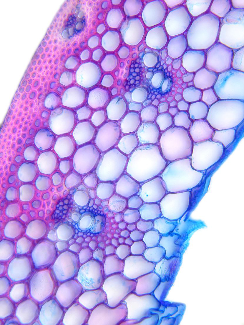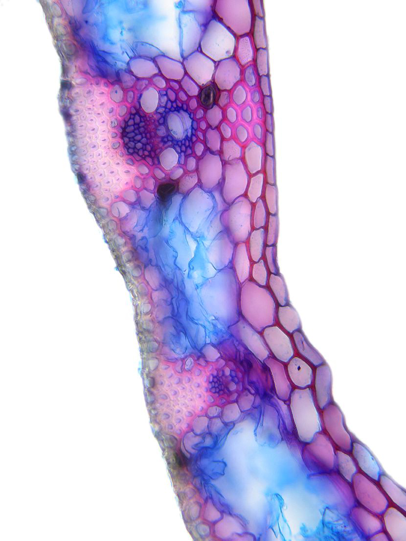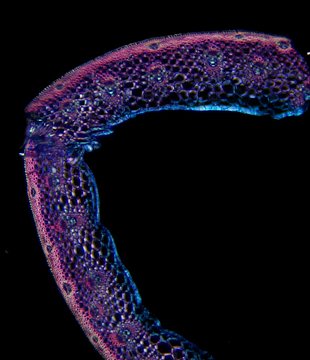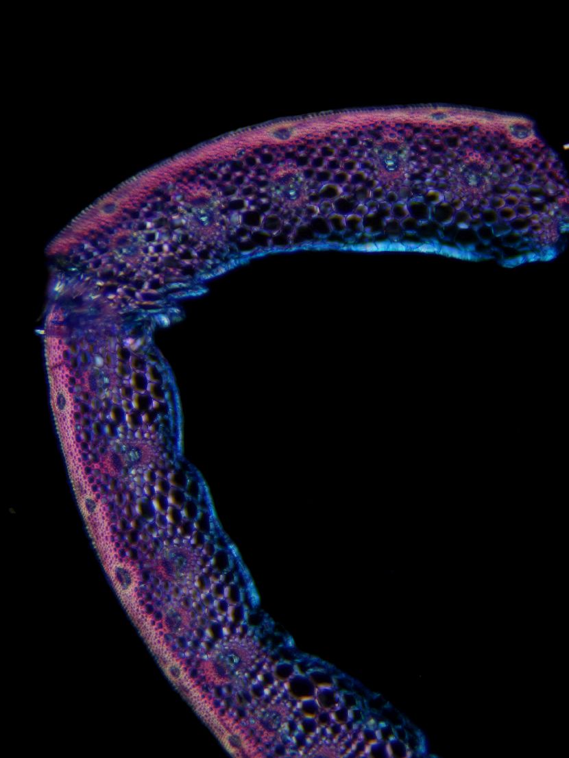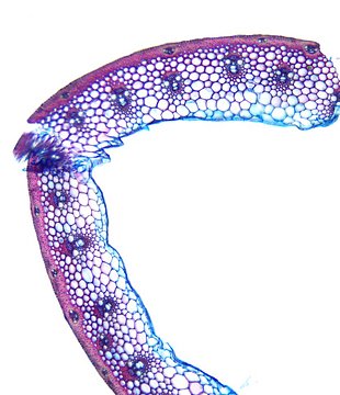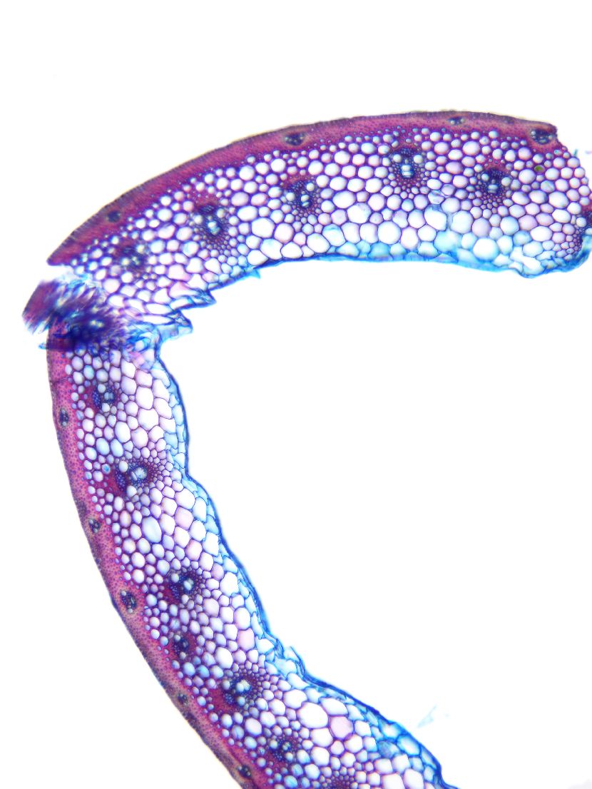 Cross-section round. Outline smooth. Culm center hollow. No visual difference between epidermis cells and sclerenchyma cells. Continuous peripheral sclerenchymatic belt. Large vascular bundles in one row. Small vascular bundles integrated in the sclerench