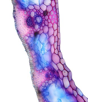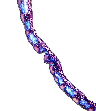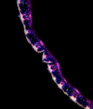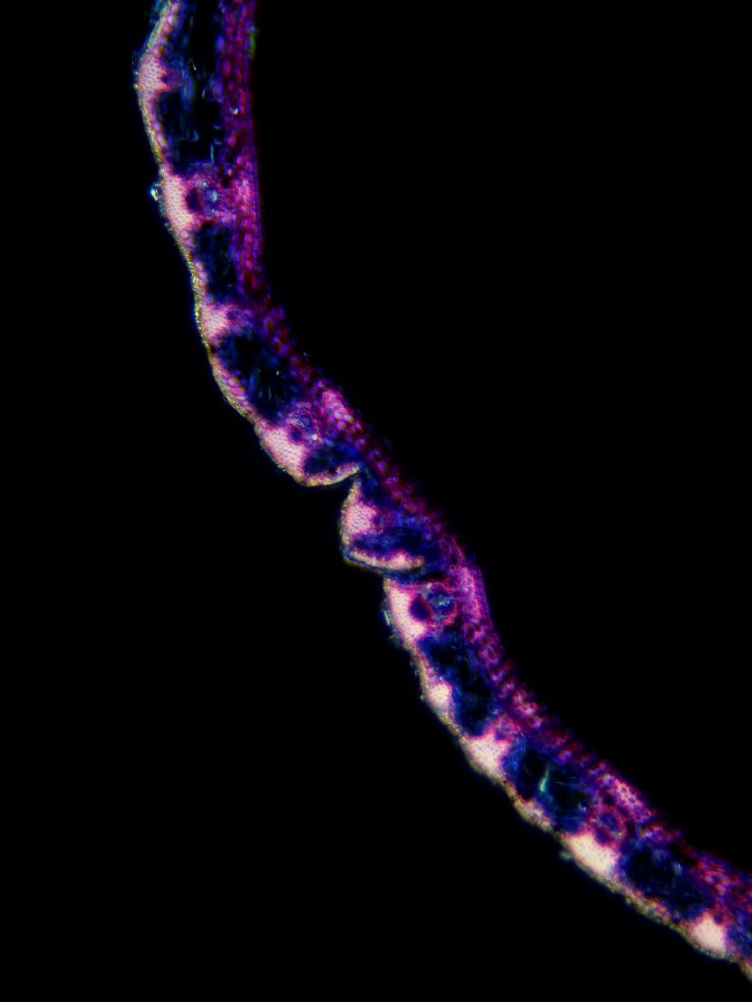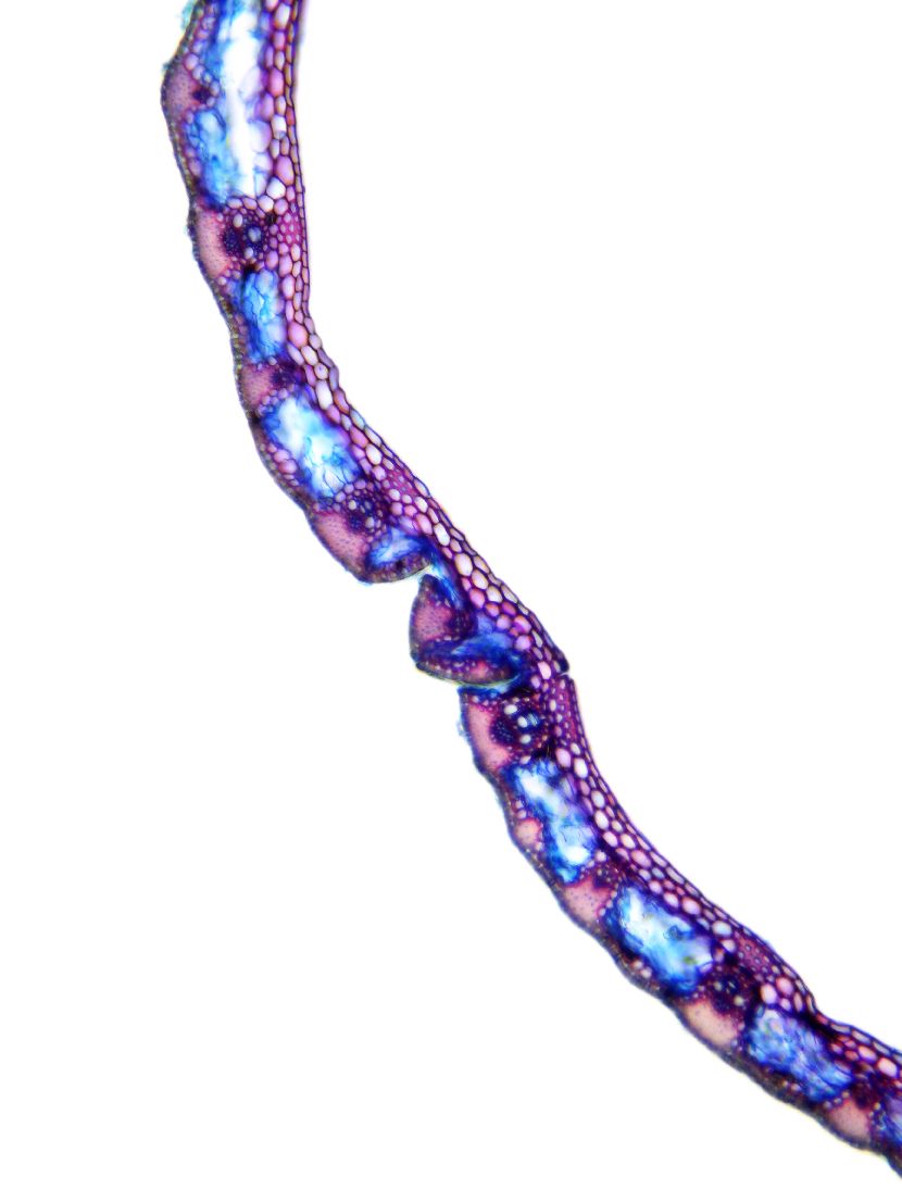 Outline wavy. Upper epidermis cells in several rows. Vascular bundles centered between the upper and lower side of the leaf. Girders extending from the vascular bundle to the lower side of the leaf.