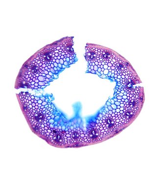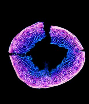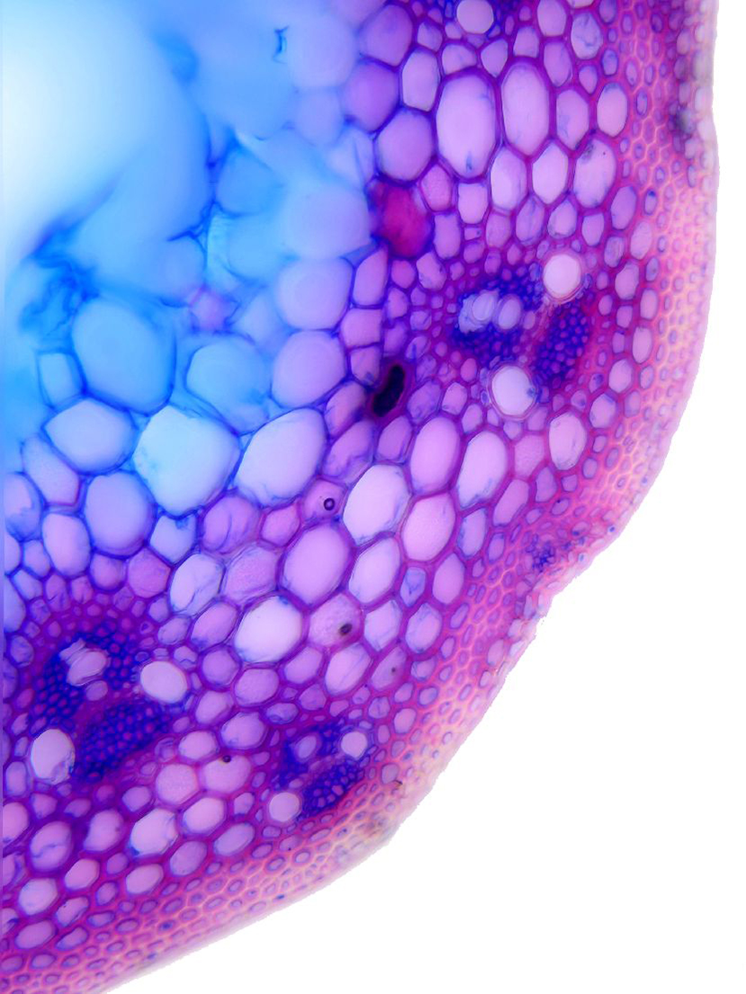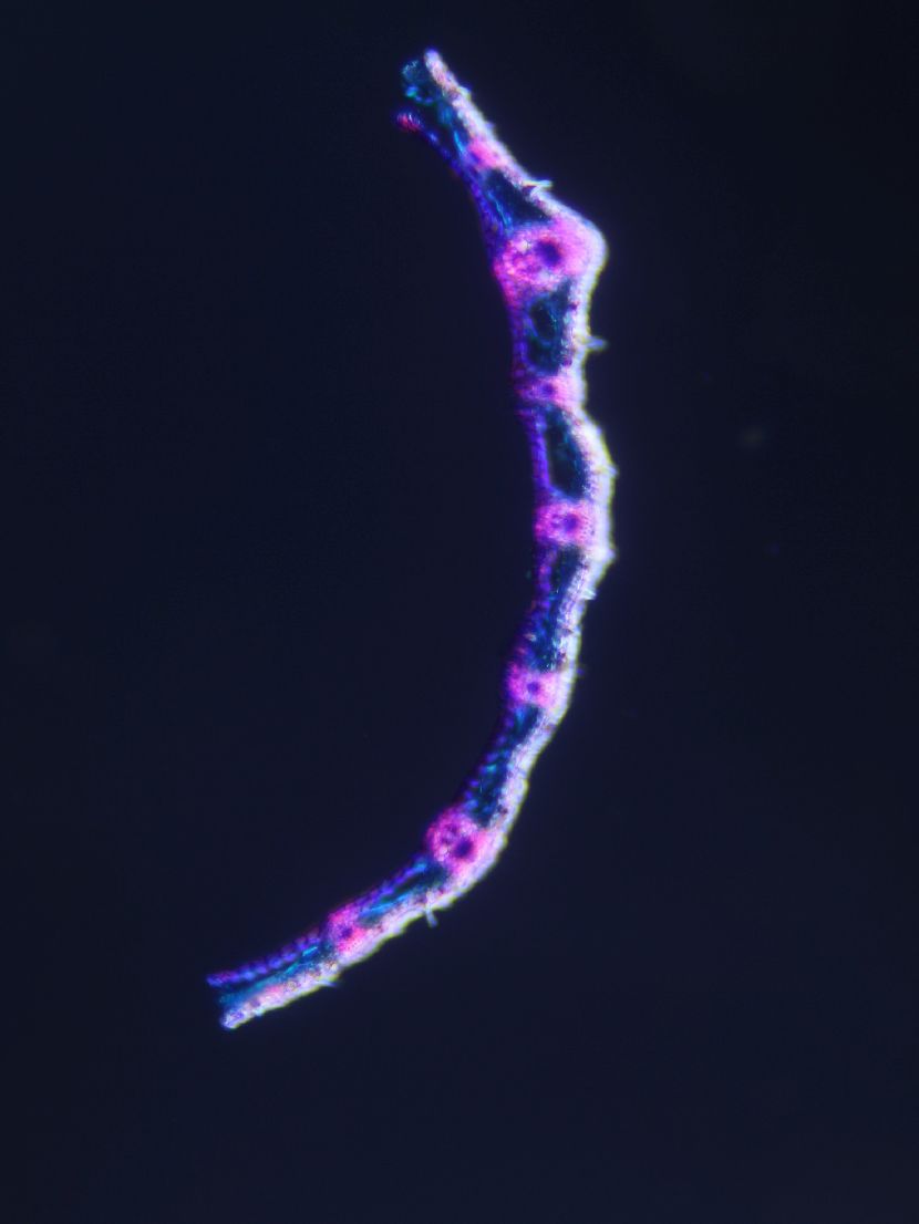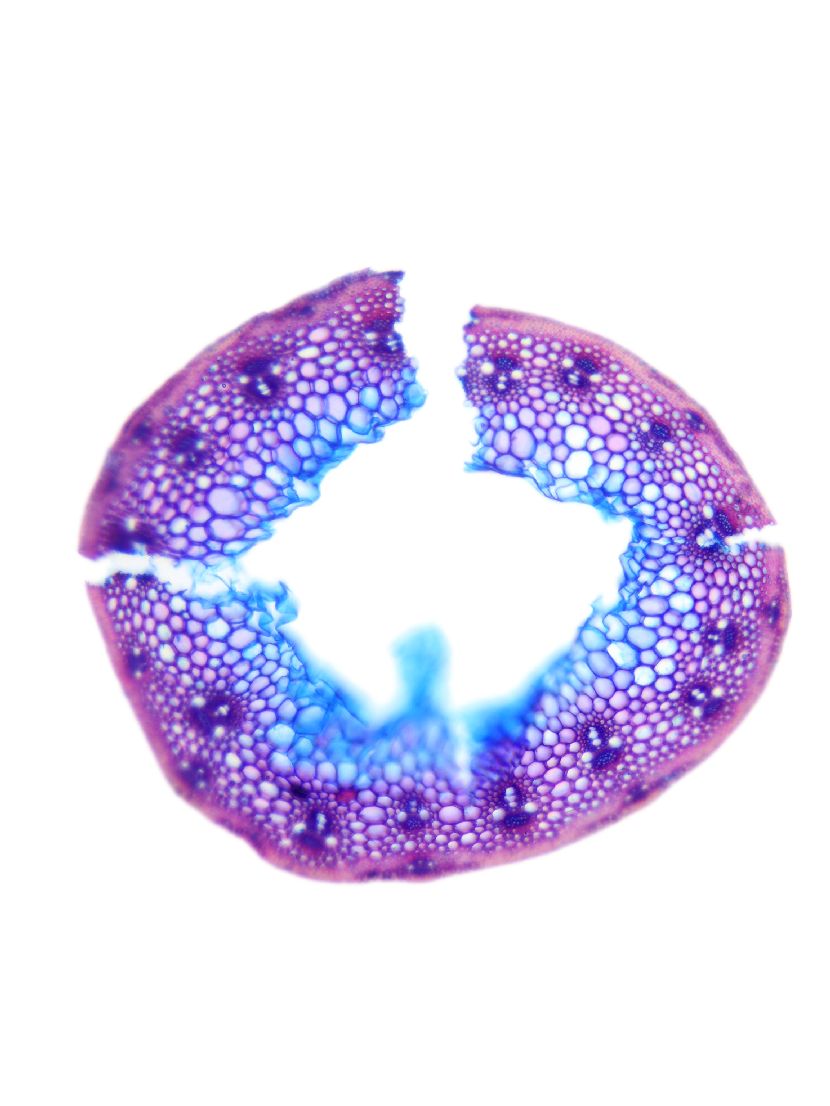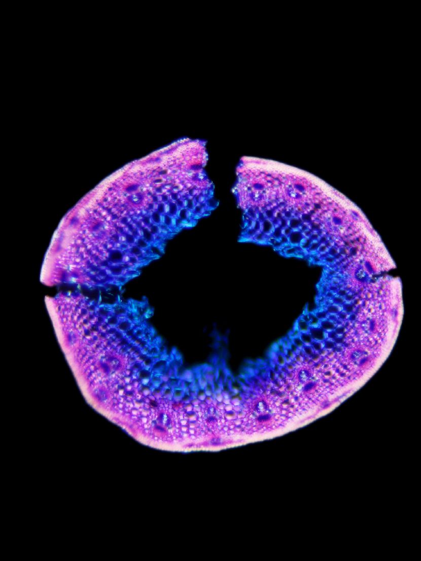 Cross-section round. Outline smooth. Culm center hollow. No visual difference between epidermis cells and sclerenchyma cells. Continuous peripheral sclerenchymatic belt. Large vascular bundles in one row. Small vascular bundles integrated in the sclerench
