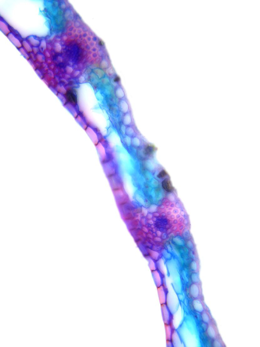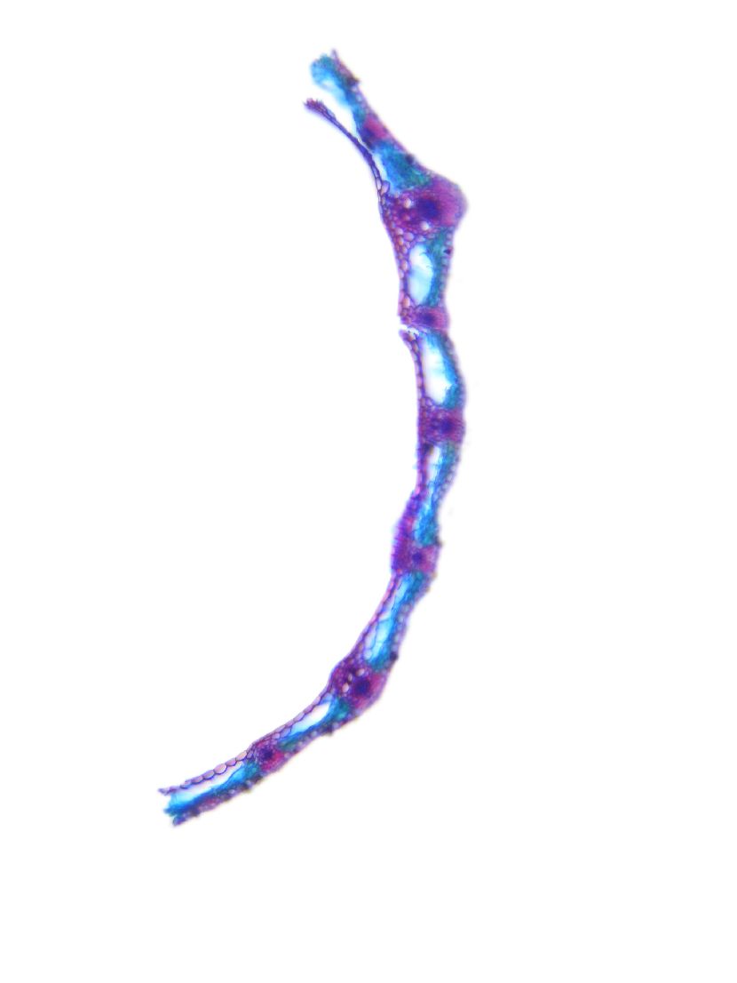 Outline wavy. Upper epidermis cells in one row. Vascular bundles centered between the upper and lower side of the leaf. Girders extending from the vascular bundle to both sides of the leaf.