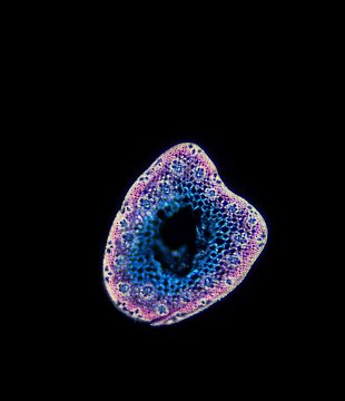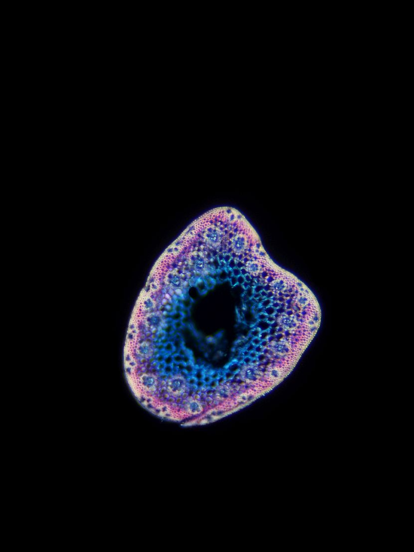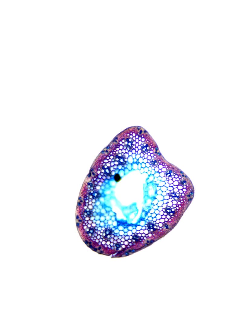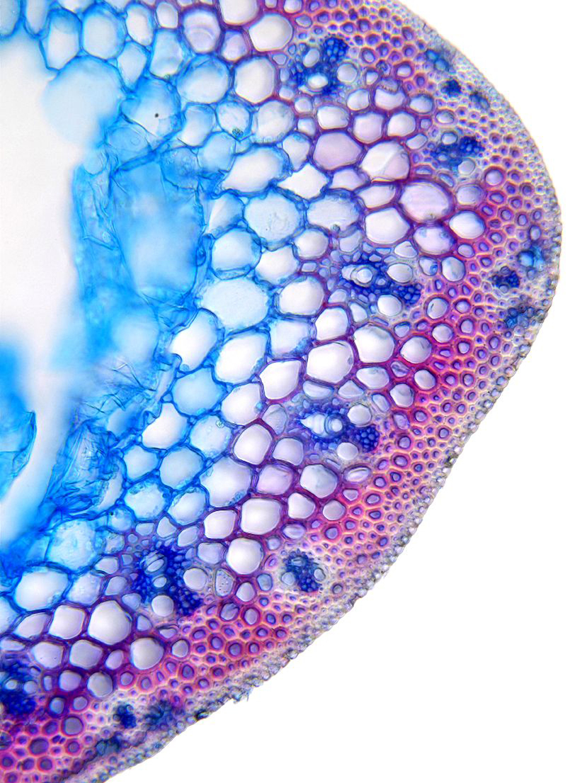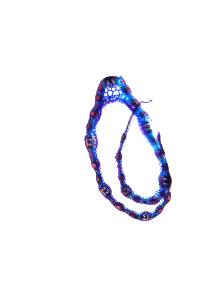 Cross-section semi-round. Outline smooth. Culm center hollow. Recognizable epidermis cells. Continuous peripheral sclerenchymatic belt. Large vascular bundles in one row. Small vascular bundles integrated in the sclerenchymatic belt. Solitary large vascul