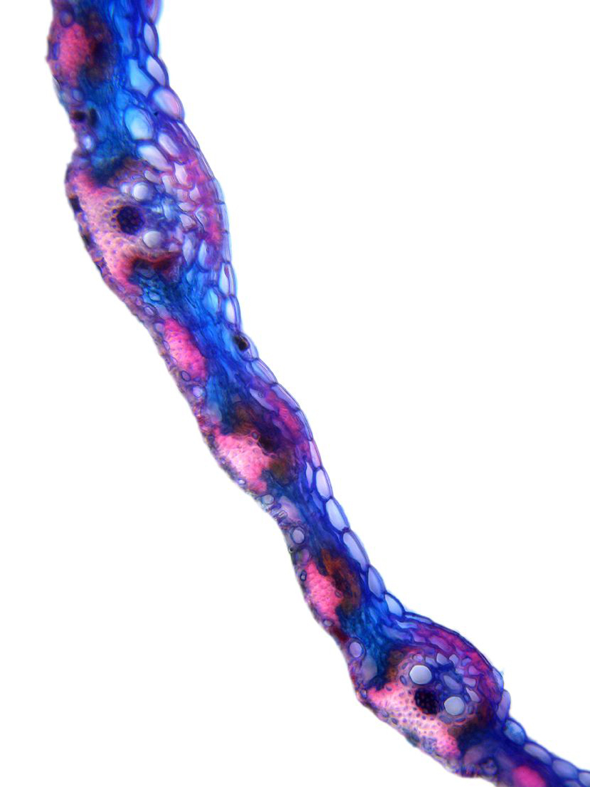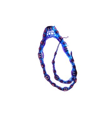 Outline wavy. Upper epidermis cells in one row. Vascular bundles near the lower side of the leaf. Girders extending from the vascular bundle to the lower side of the leaf.