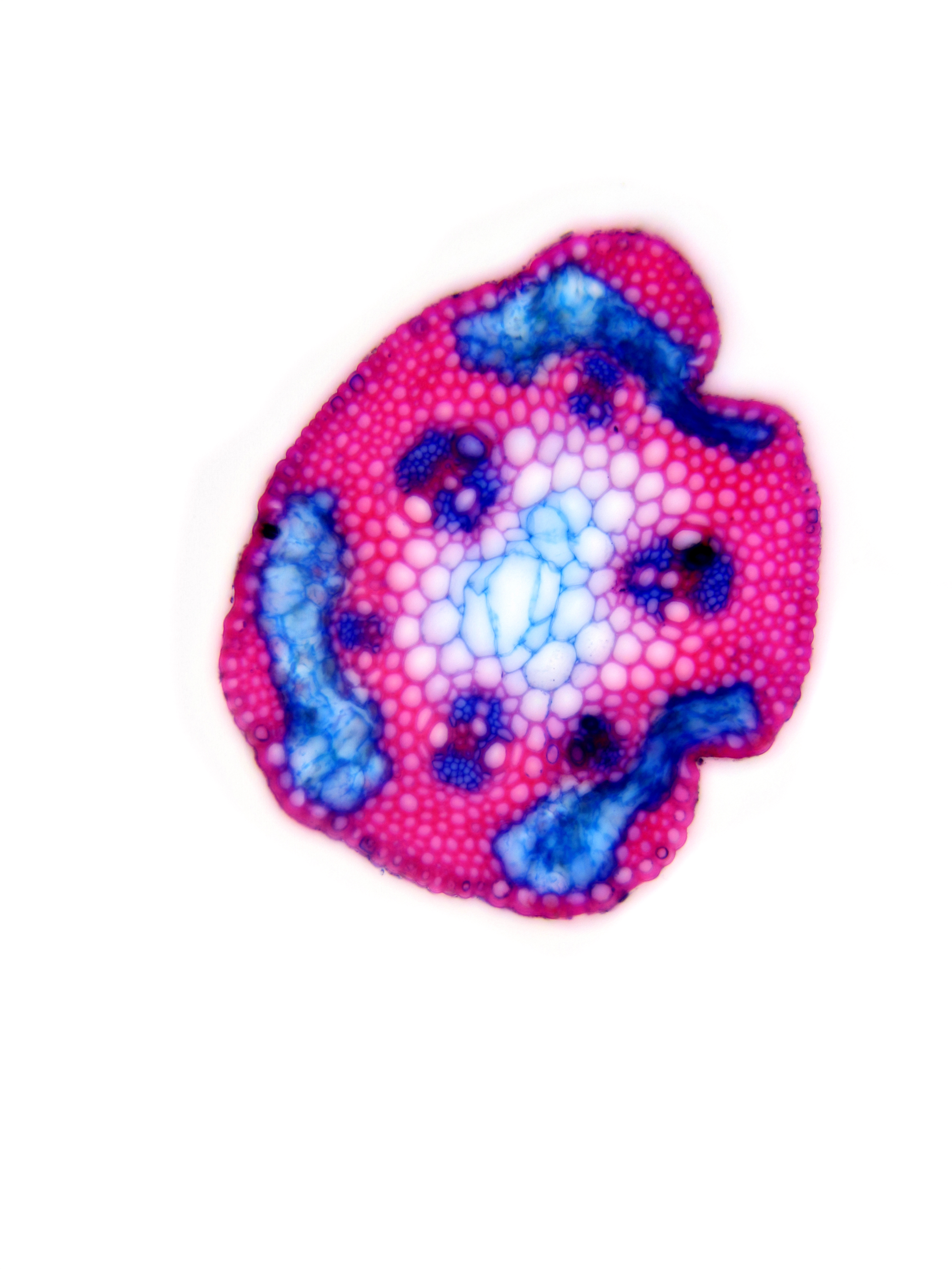 Culm-diameter < 0.5 mm, center full, radius of culm in relation to wall thickness 1:1. Outline circular with a smooth surface. Culm-center full, containing unlignified cells. Epidermis- cells thick-walled all around. Large vascular bundles arranged in one