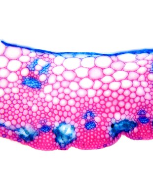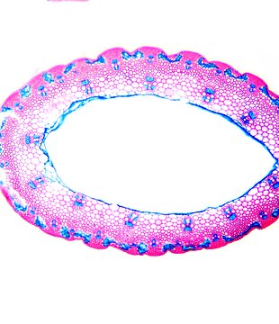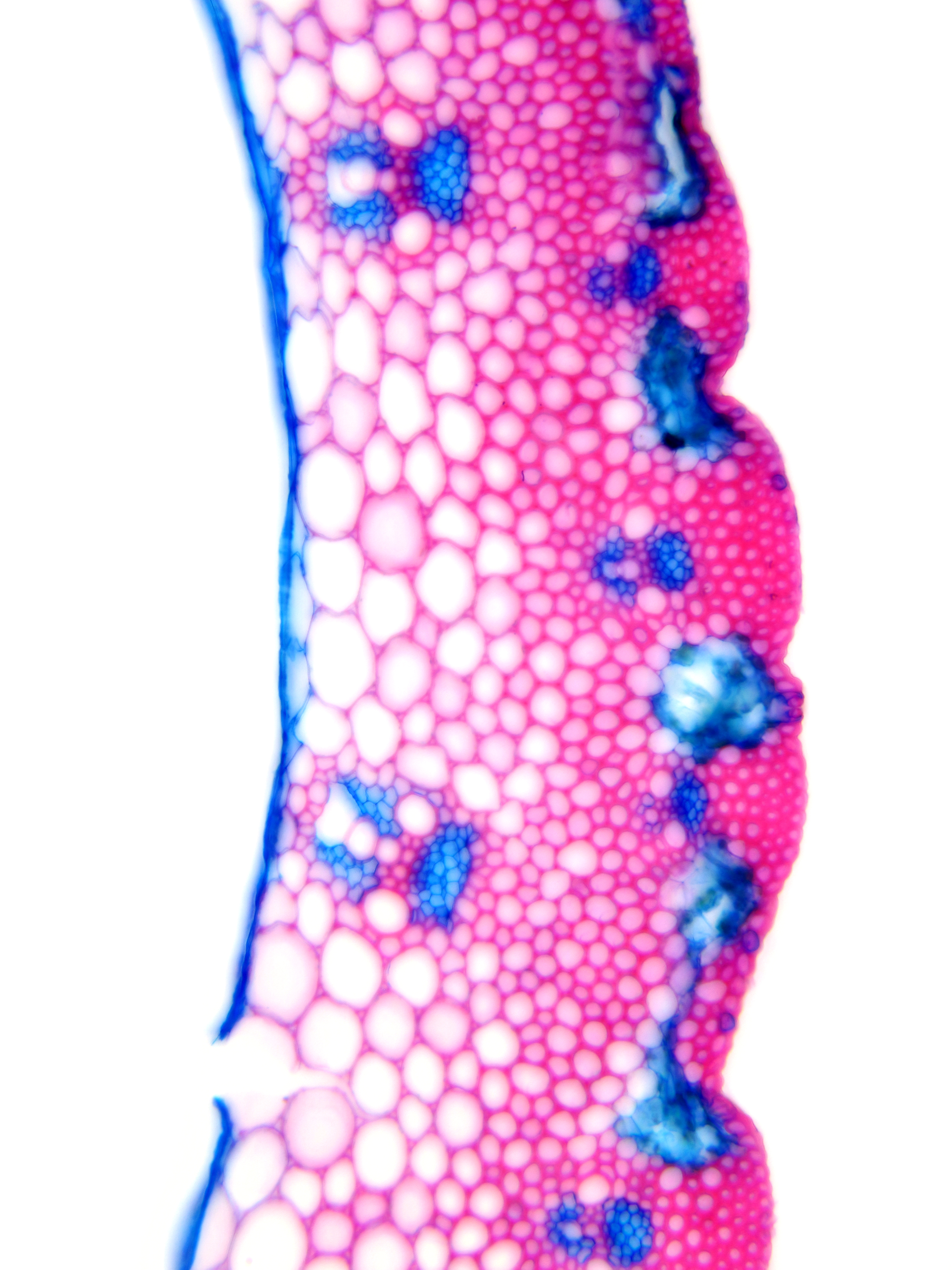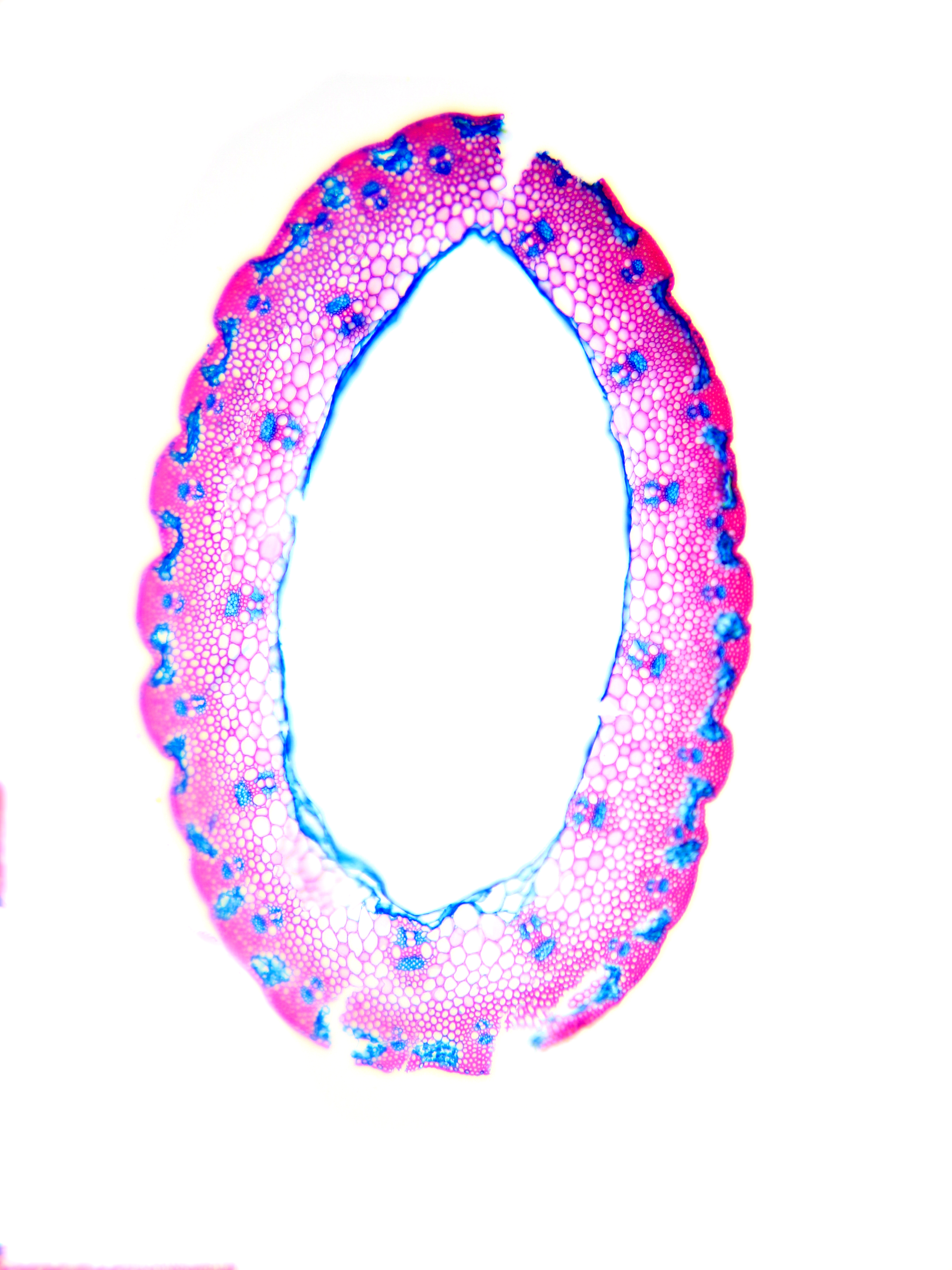 Culm-diameter 1-2 mm, wall large, radius of culm in relation to wall thickness 1:0.5. Outline circular wavy. Culm-center hollow and surrounded by a few thin-walled, not lignified cells. Epidermis-cells thick-walled all around. Large vascular bundles arran