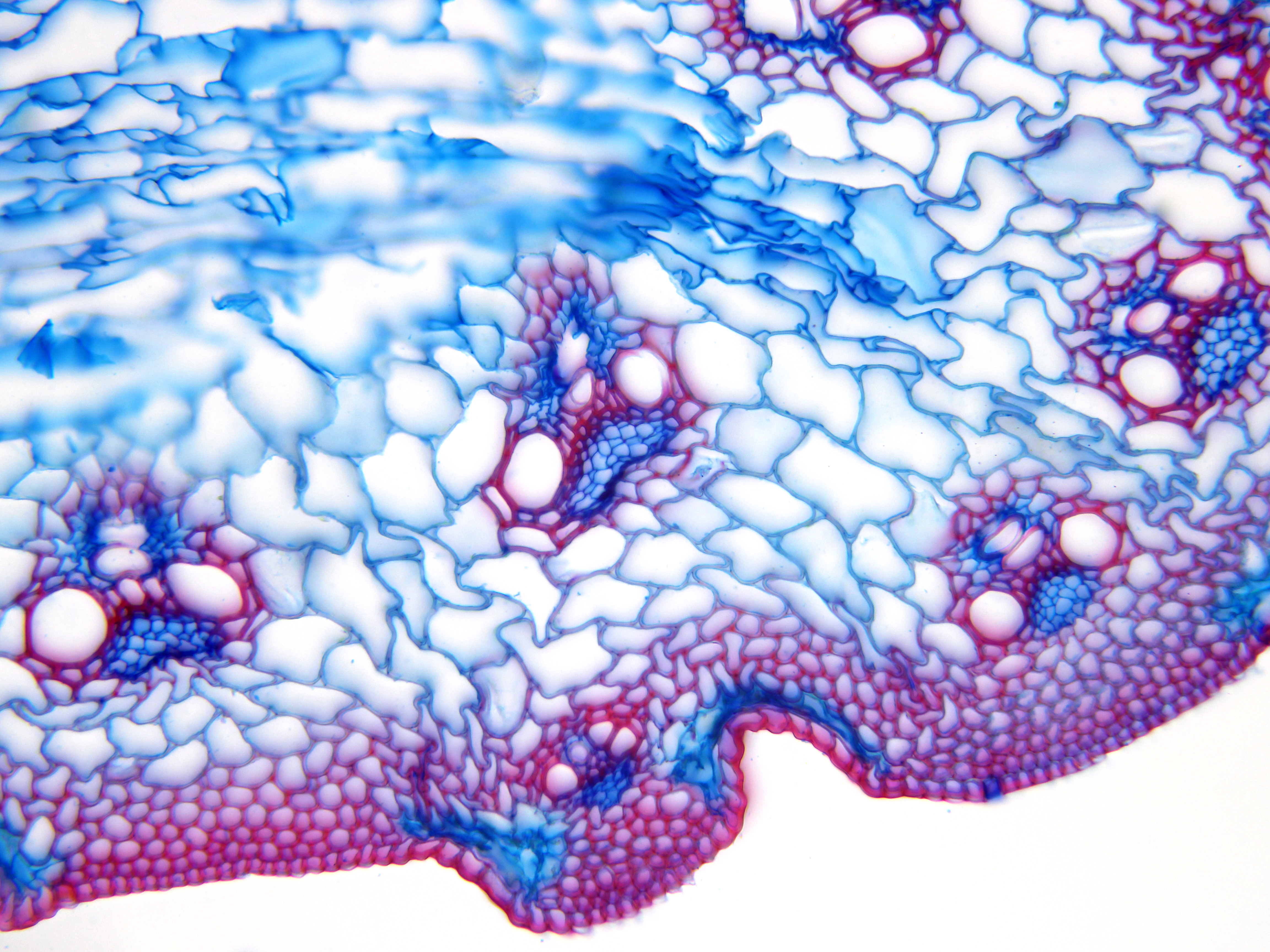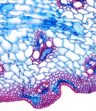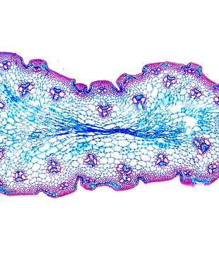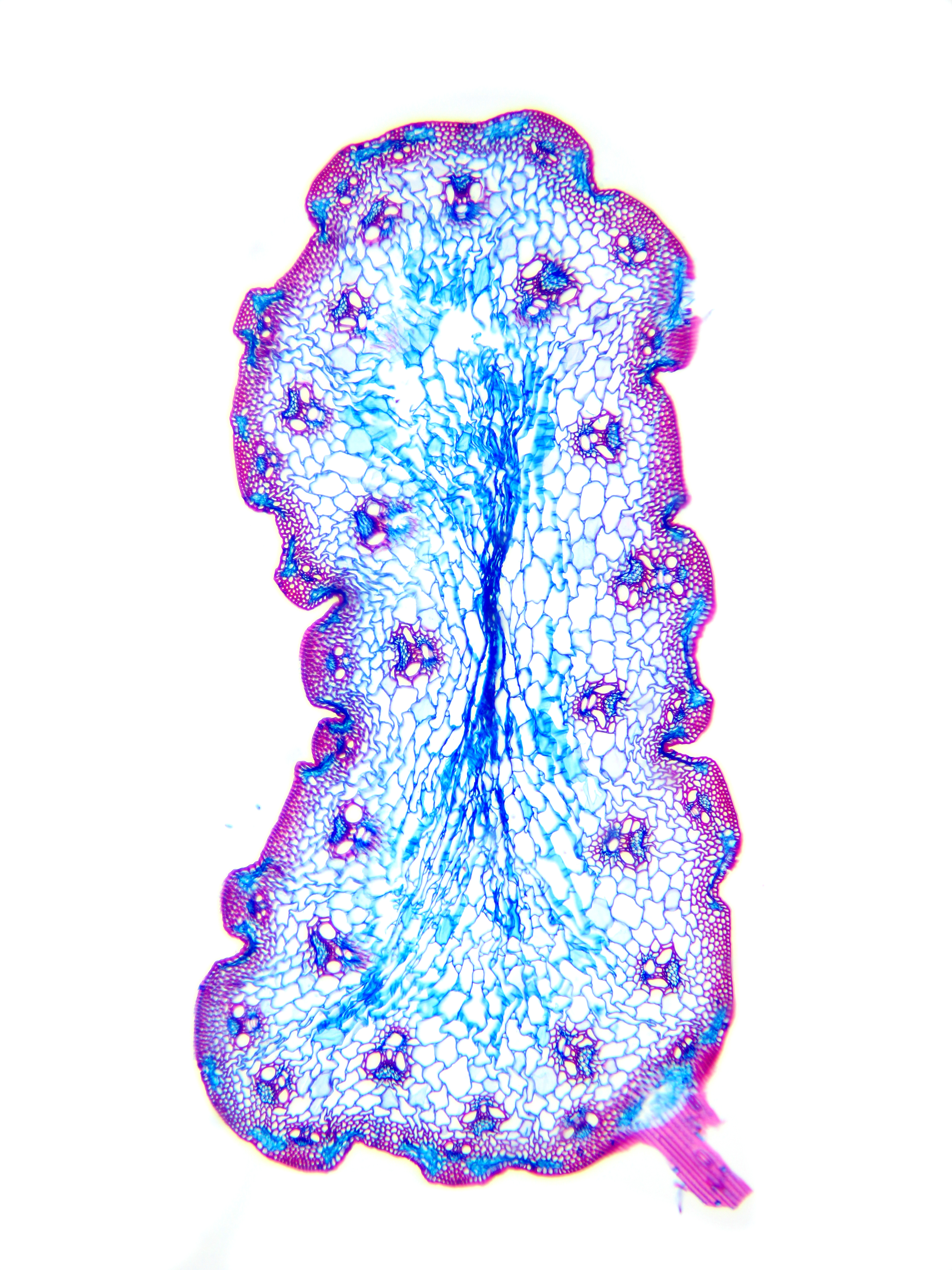 Culm-diameter 1-2 mm, center full, radius of culm in relation to wall thickness 1:1. Outline circular, with rips. Culm-center full, containing unlignified cells. Epidermis-cells thin-walled all around. Large vascular bundles arranged in 2-3 peripheral row