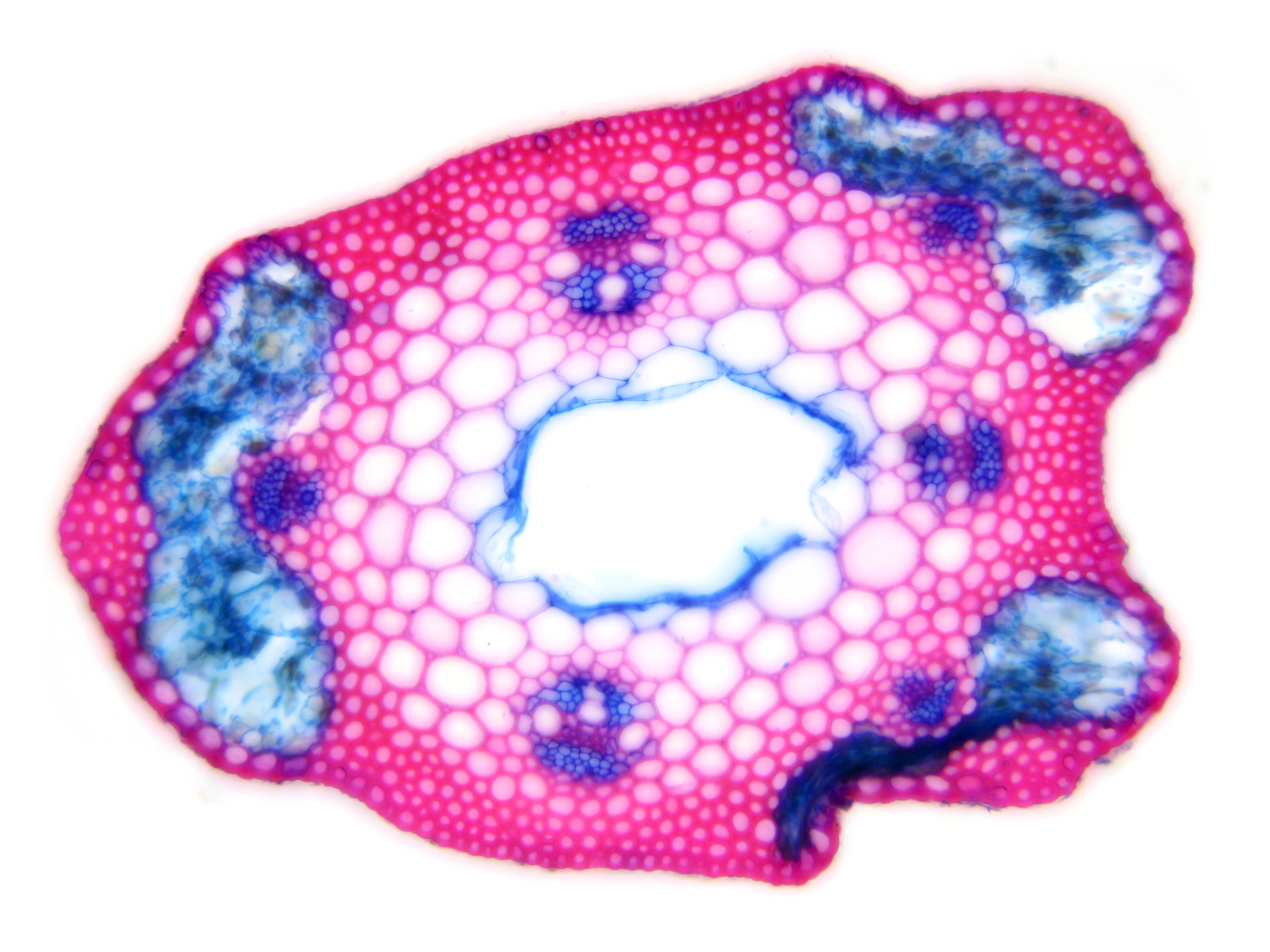 Culm-diameter < 0.5 mm, Outline circular wavy. Culm-center hollow and surrounded by a few thin-walled, not lignified cells. Epidermis-cells thick-walled all around. Large vascular bundles arranged in one peripheral row. Chlorenchyma in round, oval, square