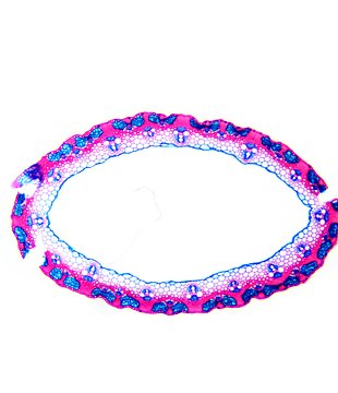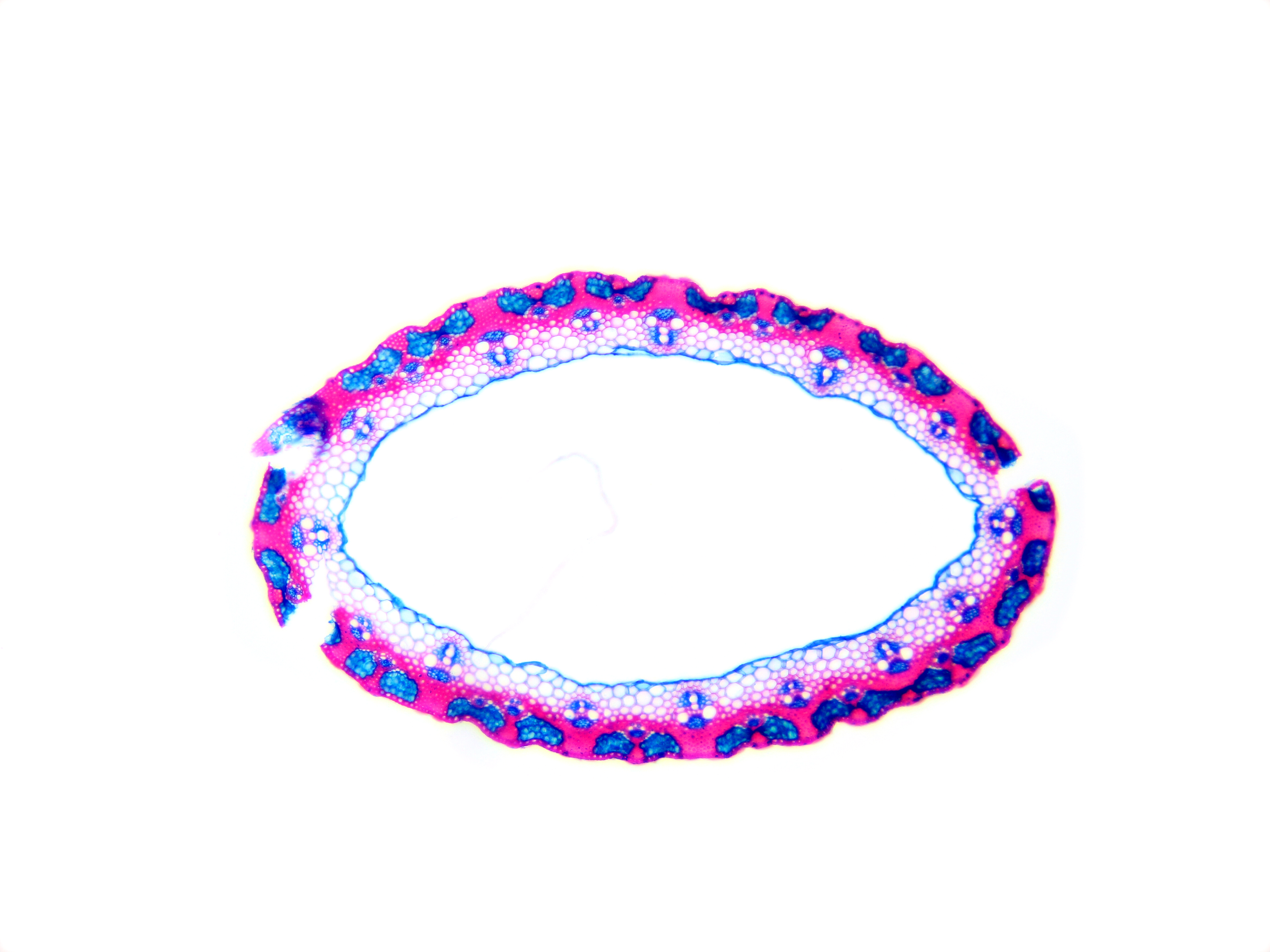 Culm-diameter 1-2 mm, wall thin, radius of culm in relation to wall thickness approximately 1:0.25 or < 0.25. Outline circular wavy. Culm-center hollow and surrounded by a few thin-walled, not lignified cells. Epidermis-cells thick-walled all around. Larg