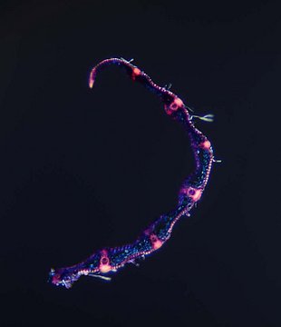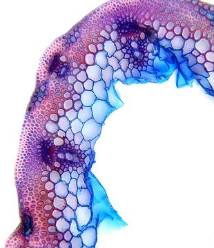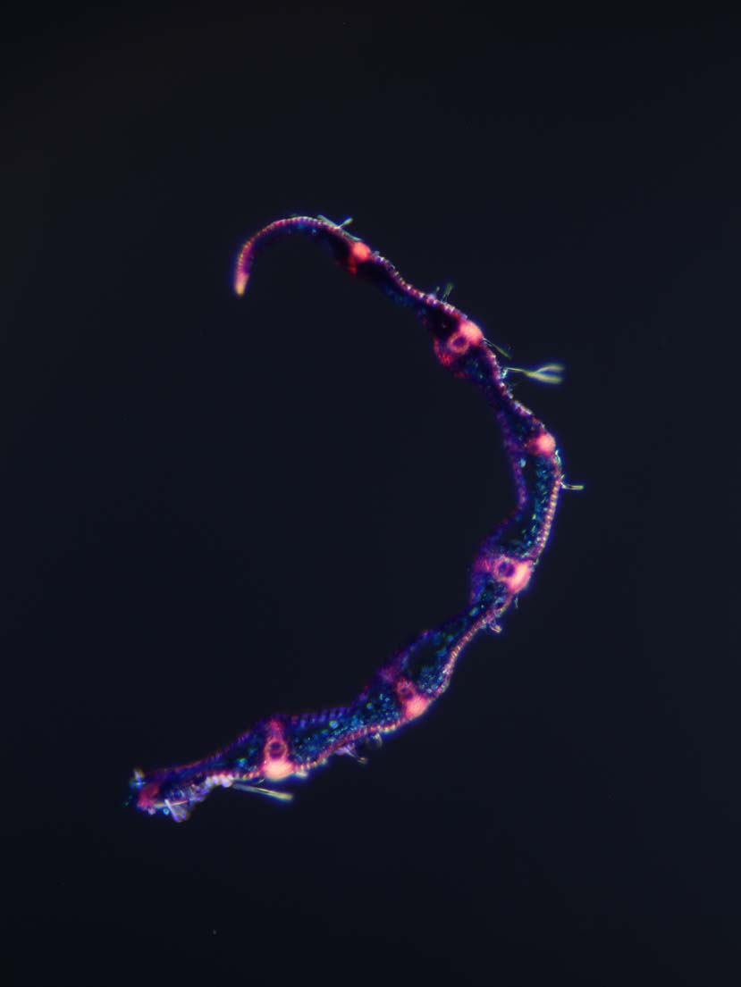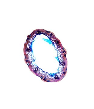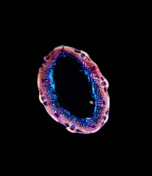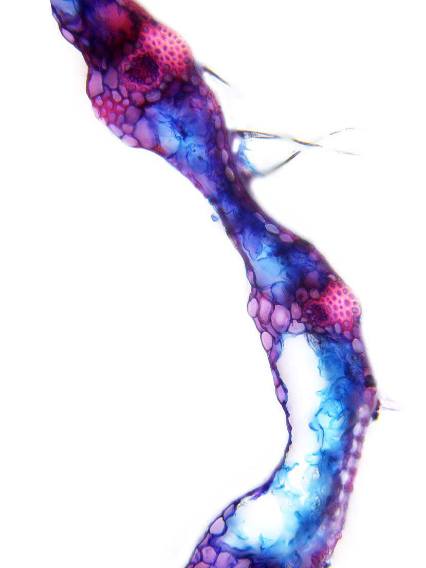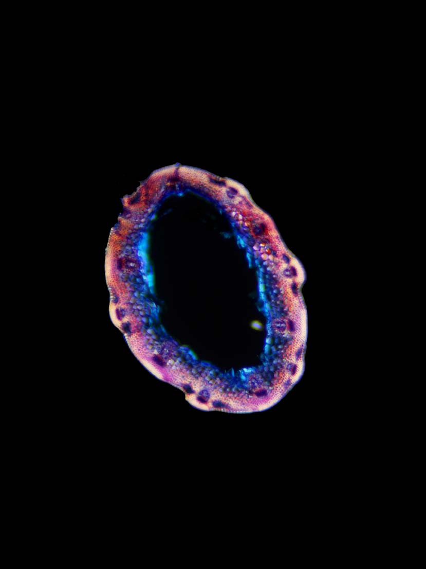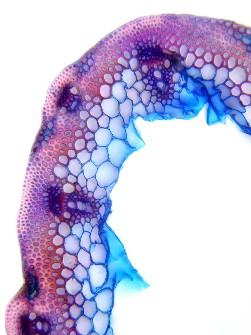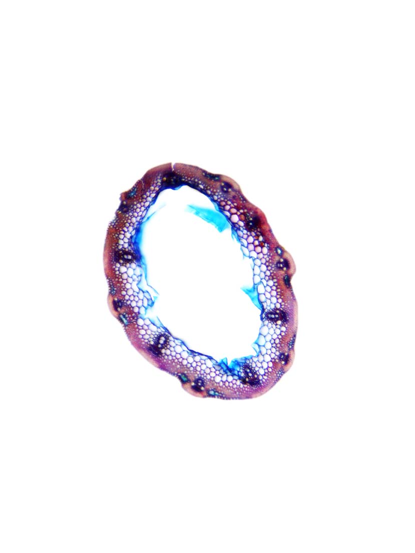 Cross-section round. Outline wavy. Culm center hollow. No visual difference between epidermis cells and sclerenchyma cells. Continuous peripheral sclerenchymatic belt. Large vascular bundles in one row. Small vascular bundles integrated in the sclerenchym
