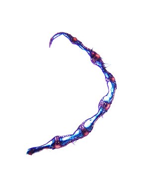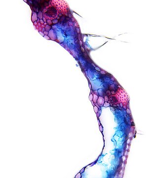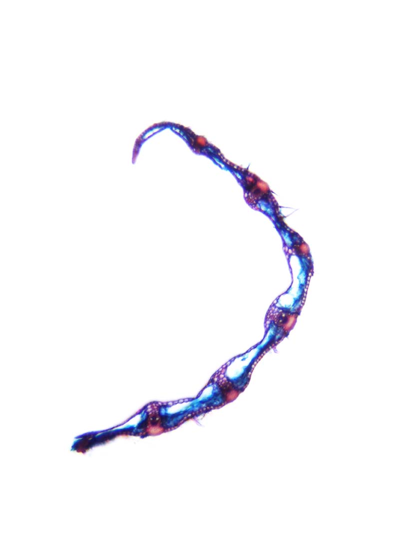 Outline wavy. Upper epidermis cells in one row. Epdermis lignified. Epidermis with hairs. Vascular bundles near the lower side of the leaf. Girders extending from the vascular bundle to the lower side of the leaf.