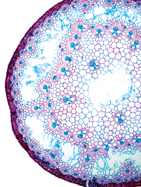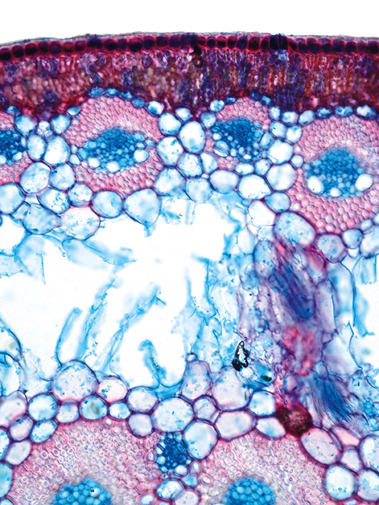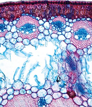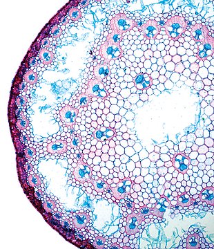 Culm-diameter 2-5 mm, wall very large, radius of culm in relation to wall thickness approximately 1: 0.75. Outline circular with a smooth surface. Center hollow and surrounded by a few thin-walled, not lignified cells. Epidermis smooth. Epidermis thin-, p