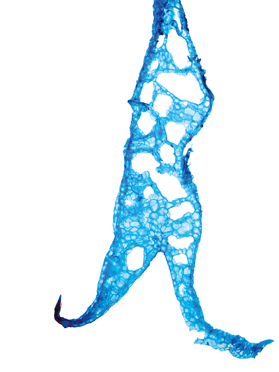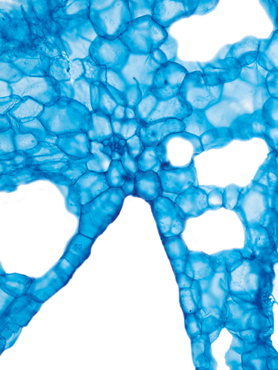 Center full, radius of culm in relation to wall thickness 1:1. Outline of other form. Epidermis smooth. Epidermis cells thin-walled all around. Chlorenchyma present, continuous peripheral belt with unlignified round cells (like a large cortex). Aerenchyma