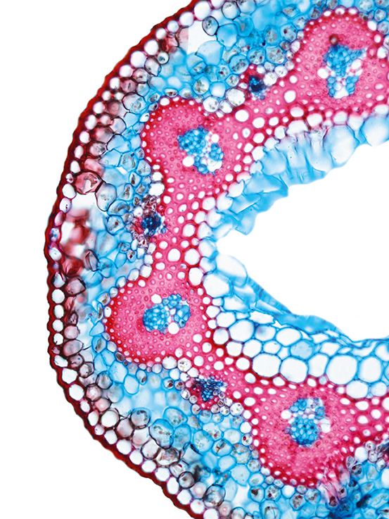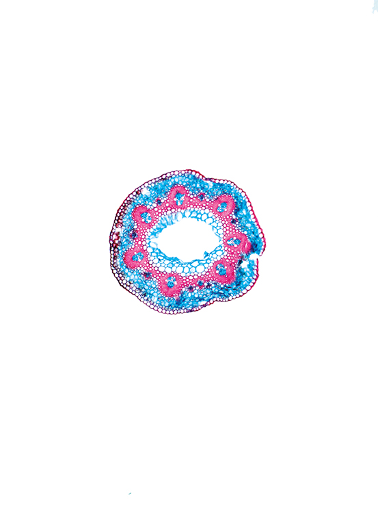 Culm-diameter 0.5-1 mm, wall very large, radius of culm in relation to wall thickness approximately 1: 0.75. Outline circular with a smooth surface. Center hollow and surrounded by many large thin-walled, not lignified cells. Without cortex/cylinder separ