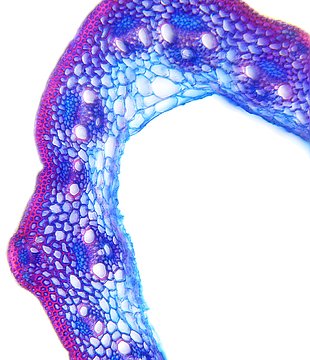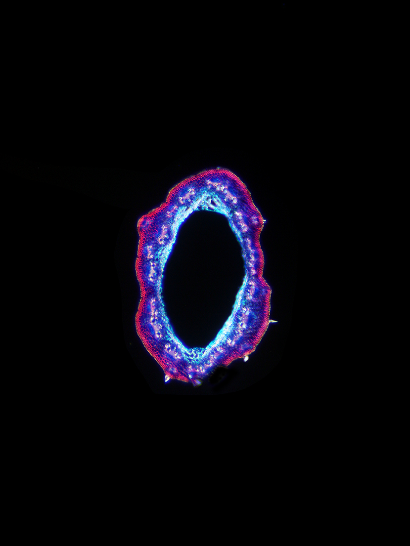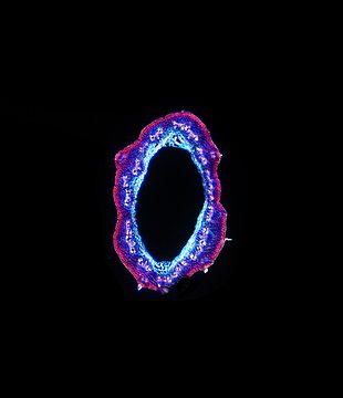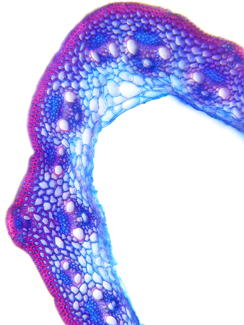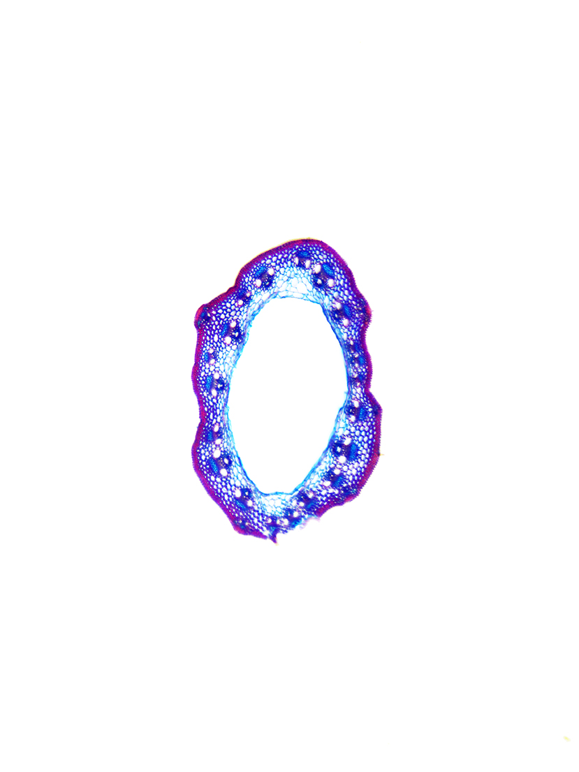 Cross-section round. Outline wavy. Culm center hollow. Recognizable epidermis cells. Peripheral sclerenchymatic stabilisation structure (girders) conic. Large vascular bundles in one row. Vascular bundles integrated in peripheral stabilisation structure (