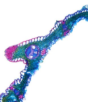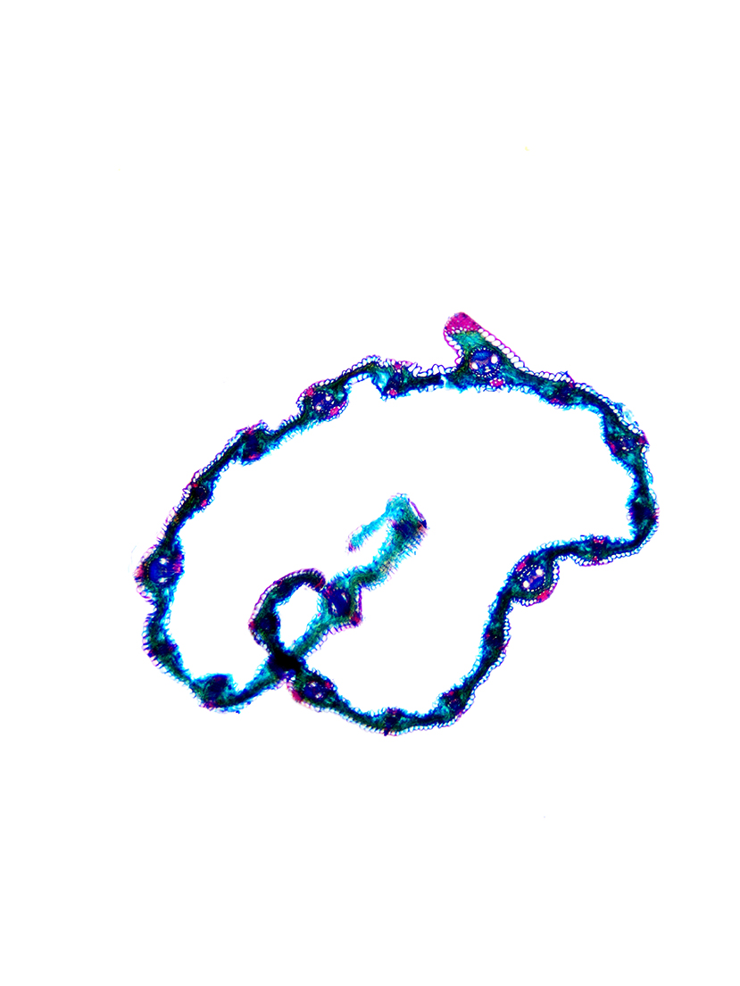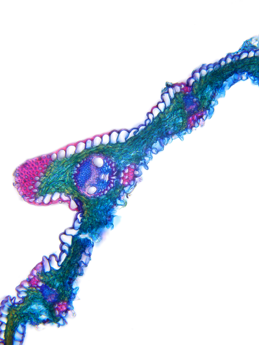 Outline wavy. Upper and lower epidermis cells of equal size and shape. Upper epidermis cells in one row. Epdermis lignified. Vascular bundles near the upper side of the leaf