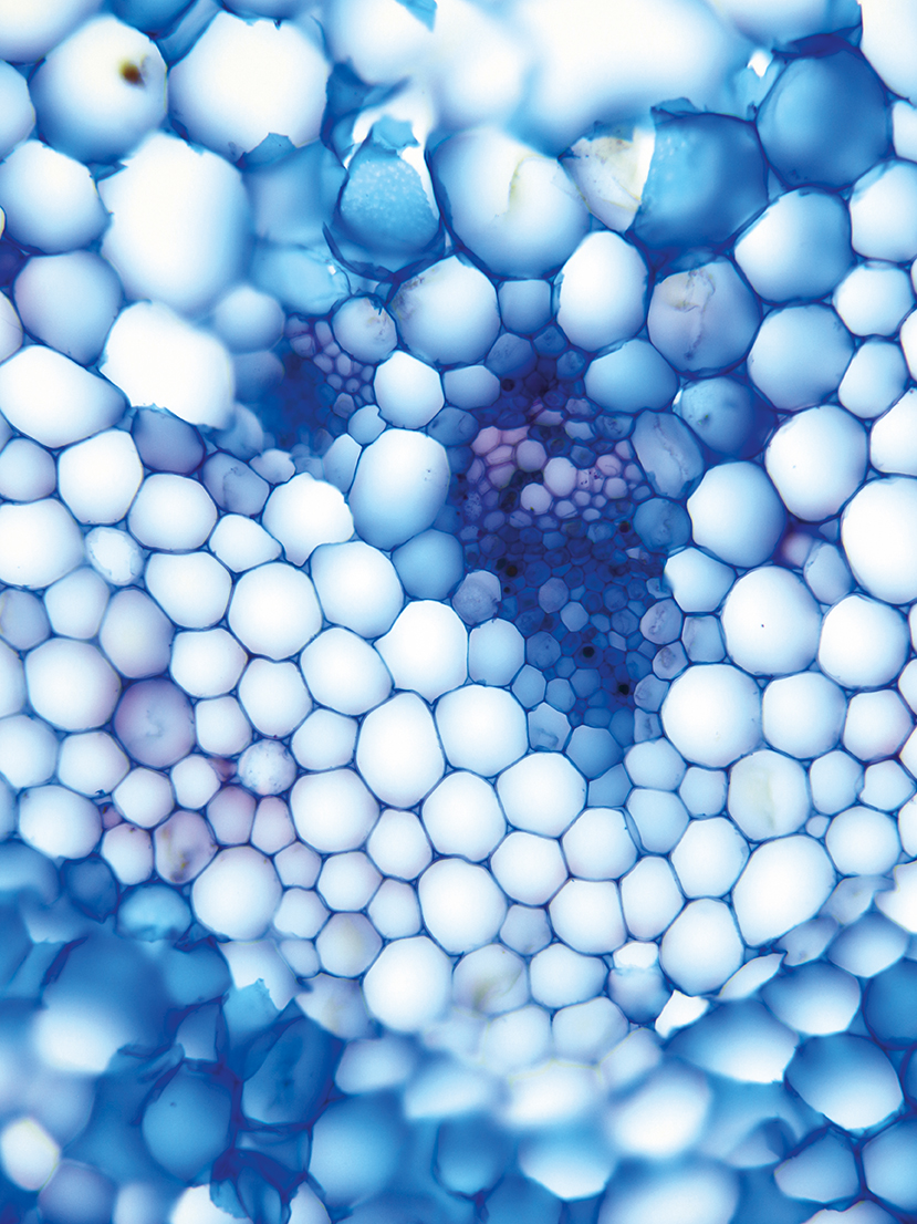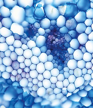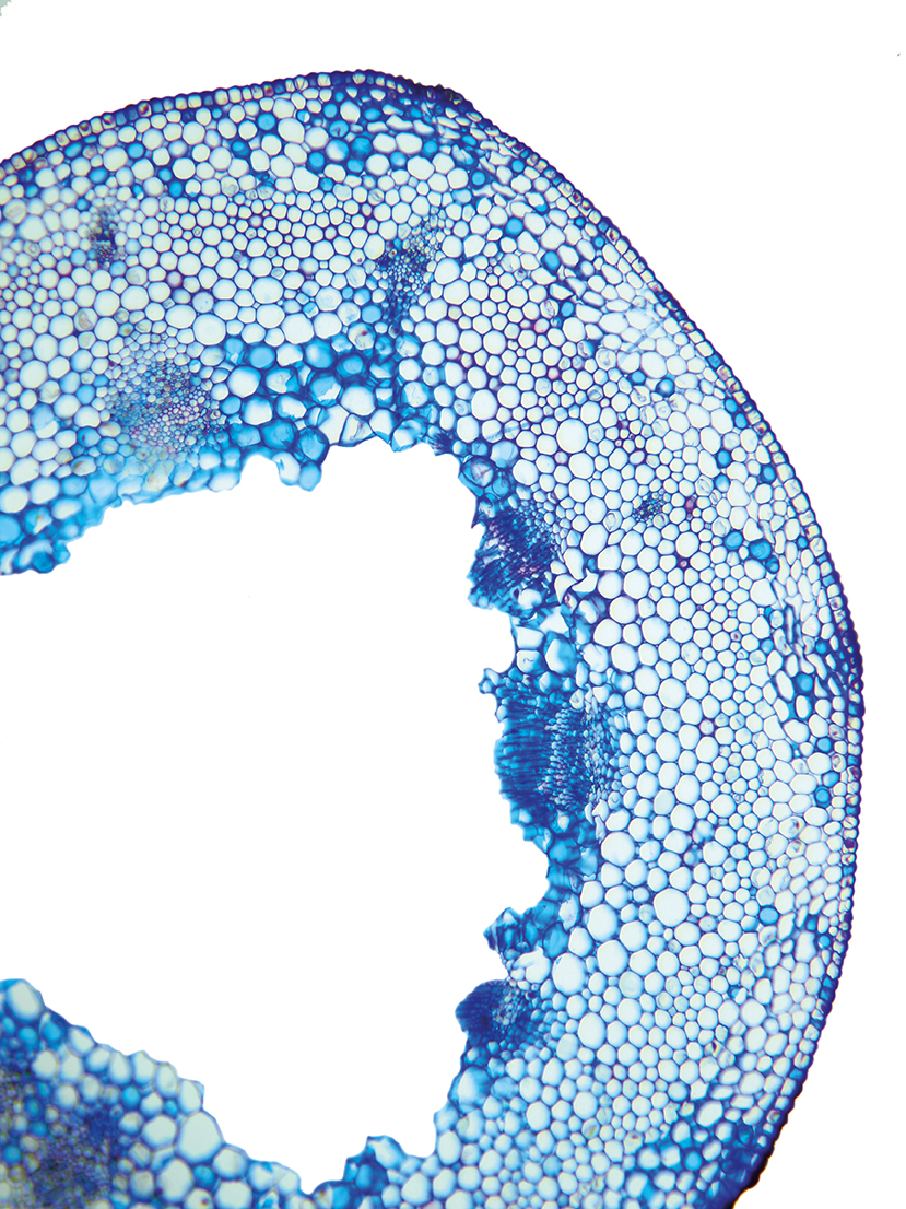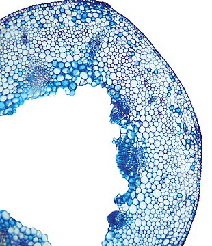 Culm-diameter 2-5 mm, wall large, radius of culm in relation to wall thickness approximately 1: 0.5. Outline circular with a smooth surface. Center hollow and surrounded by many large thin-walled, not lignified cells. Without cortex/cylinder separation.