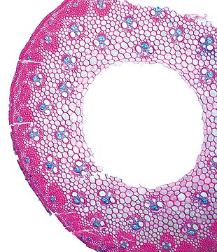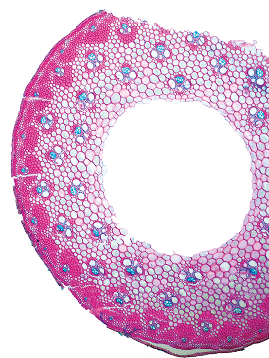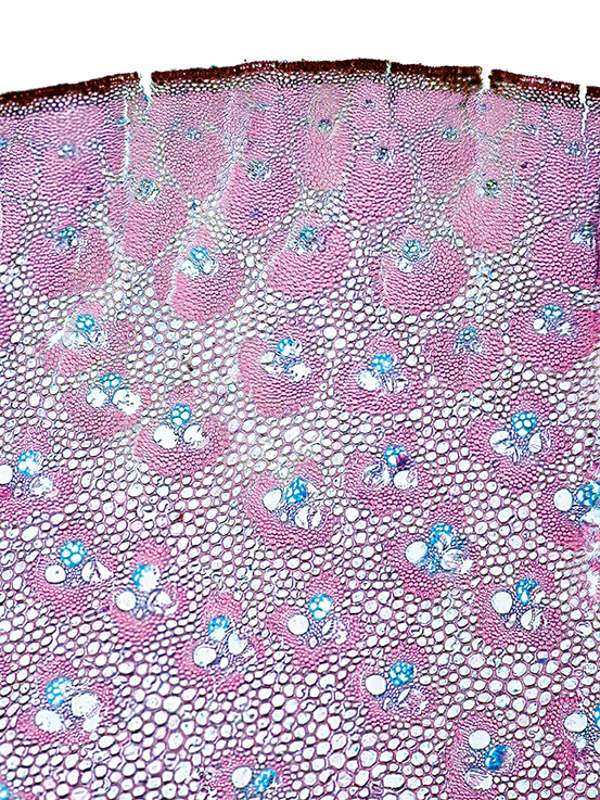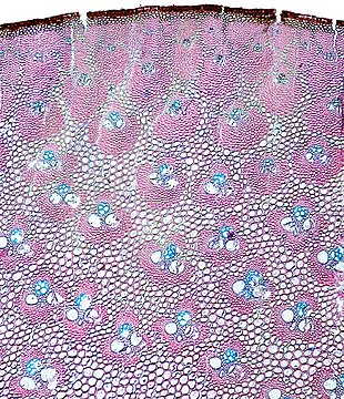 Culm-diameter 5-10 mm, wall very large, radius of culm in relation to wall thickness approximately 1: 0.75. Outline circular with a smooth surface. Center hollow, surrounded by thin-walled lignified cells. Without cortex/cylinder separation. Epidermis smo