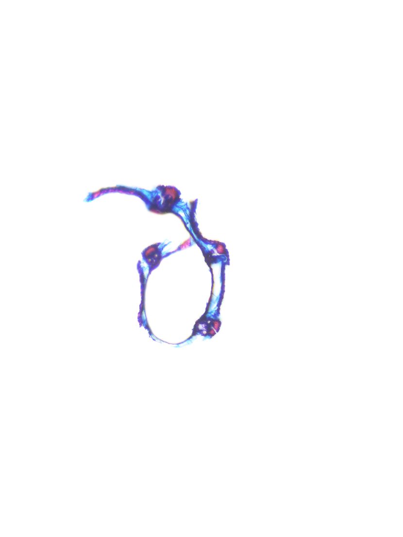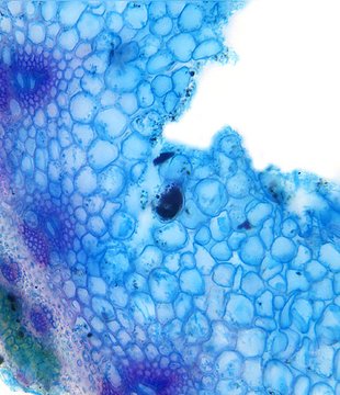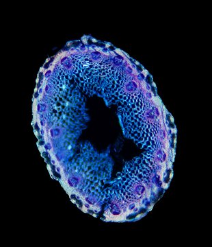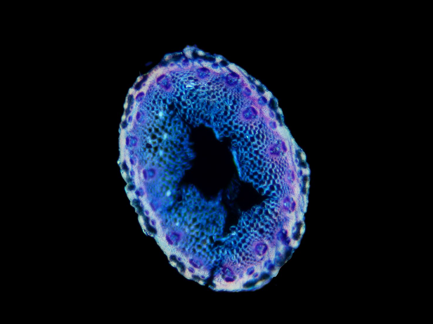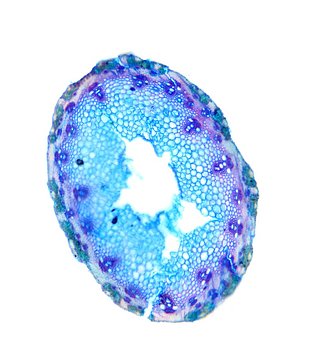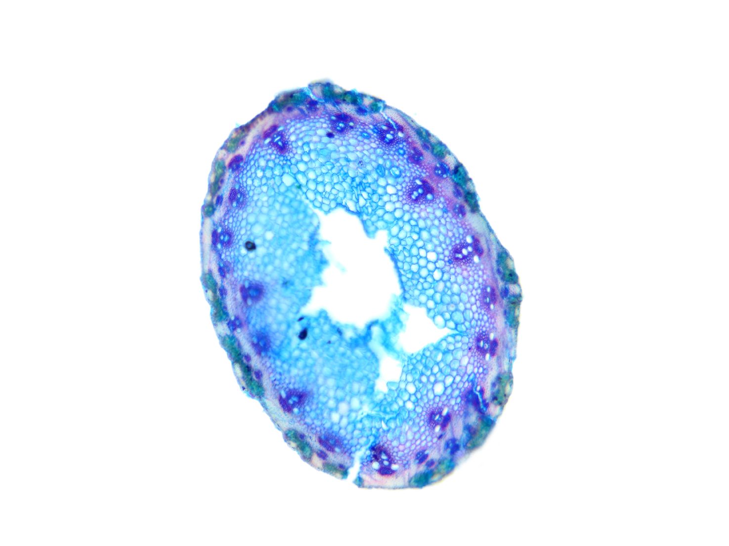 Cross-section round. Outline smooth. Culm center hollow. Recognizable epidermis cells. Continuous peripheral sclerenchymatic belt. Large vascular bundles in one row. Small vascular bundles integrated in the sclerenchymatic belt. Solitary large vascular bu