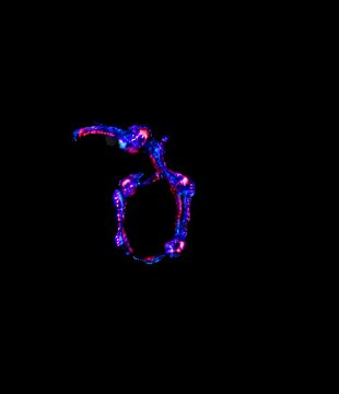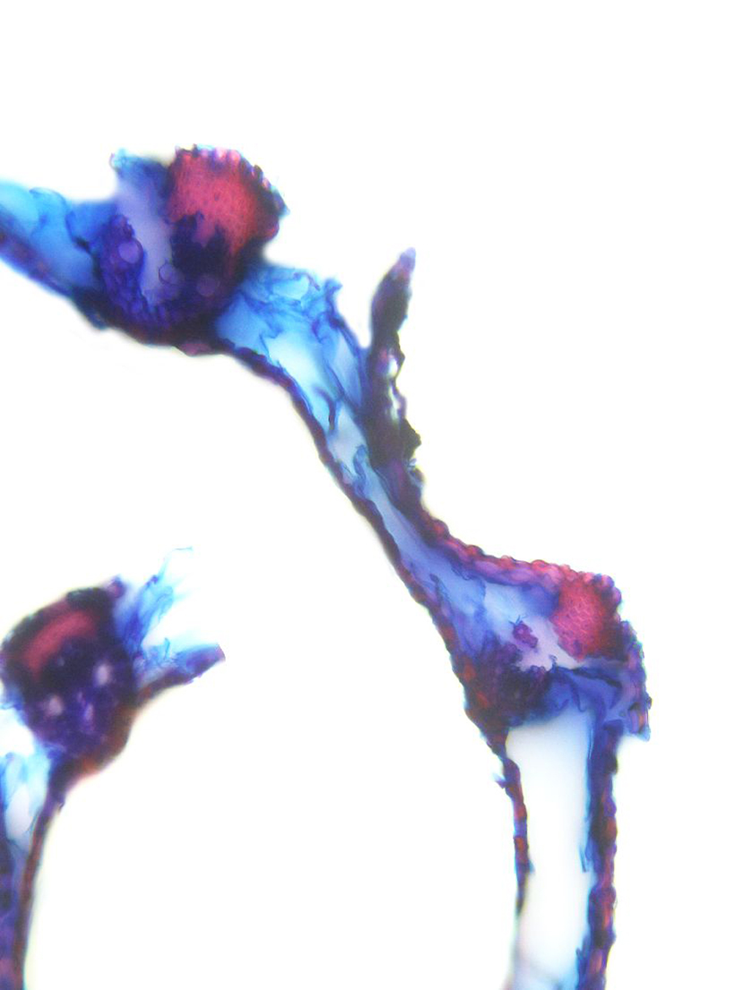 Outline wavy. Upper epidermis cells in one row. Vascular bundles centered between the upper and lower side of the leaf. Girders extending from the vascular bundle to the lower side of the leaf.