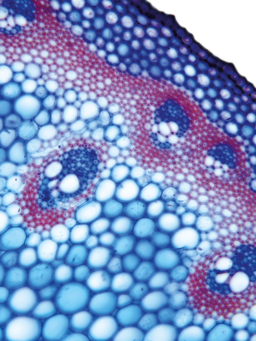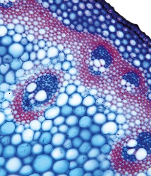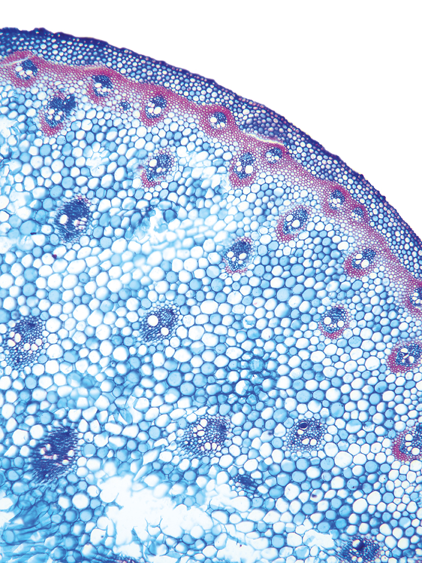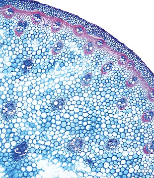 Culm-diameter 5-10 mm, center full, radius of culm in relation to wall thickness 1:1. Outline circular with a smooth surface. Culm-center full, containing unlignified cells. Without cortex/cylinder separation. Epidermis cells thick-walled all around. Larg