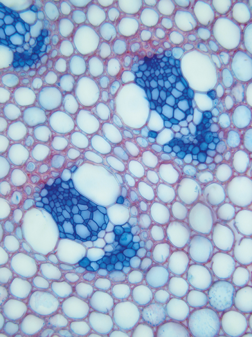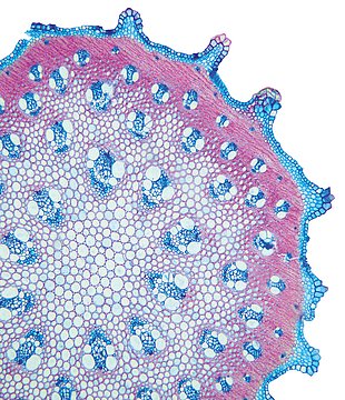 Culm-diameter 10-100 mm, center full, radius of culm in relation to wall thickness 1:1. Culm-center full, containing lignified cells. Without cortex/cylinder separation. Culm without endodermis but with a sheath of lignified cells around the center. Epide