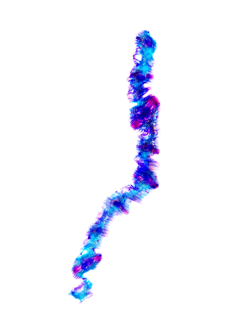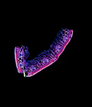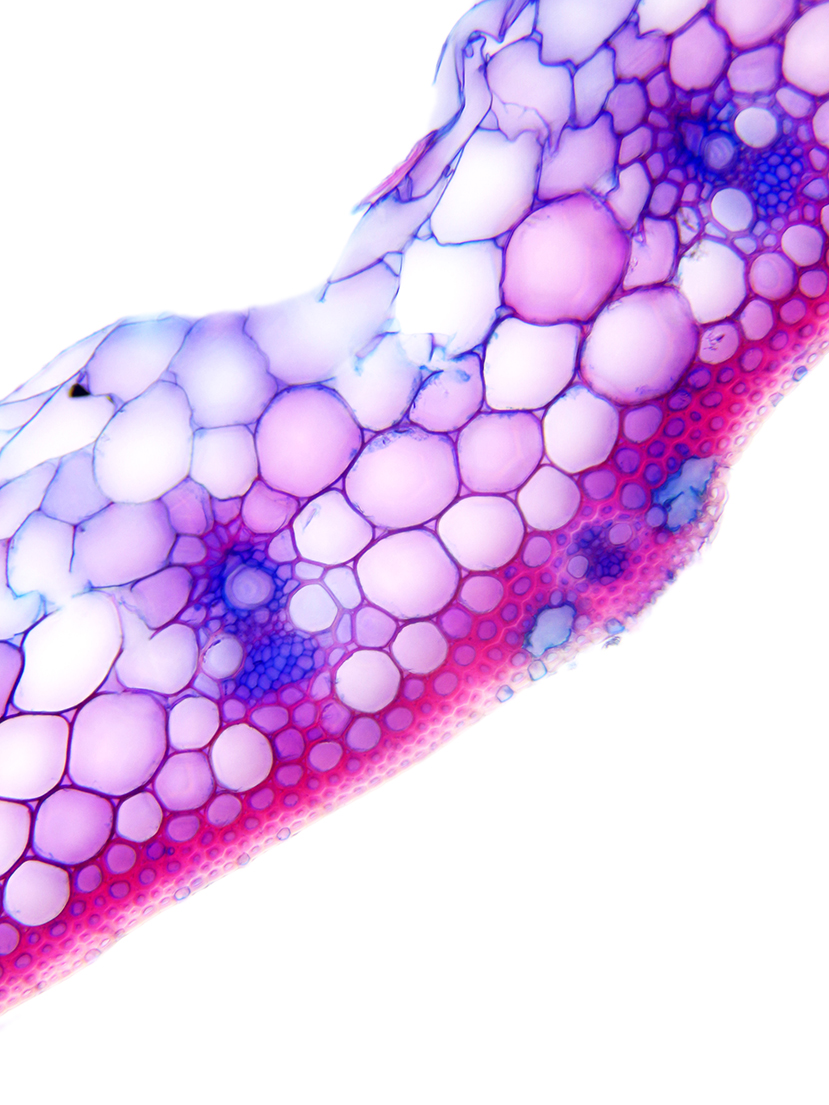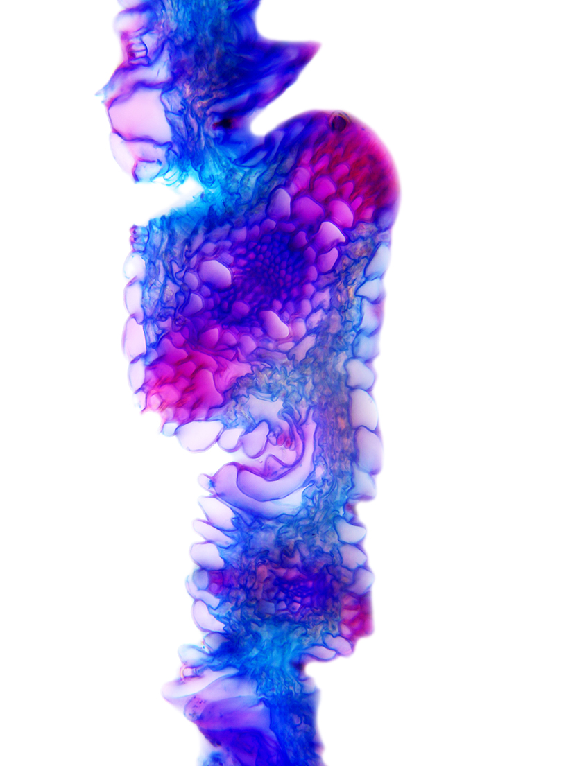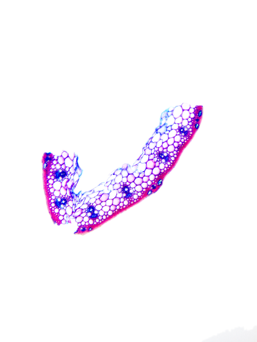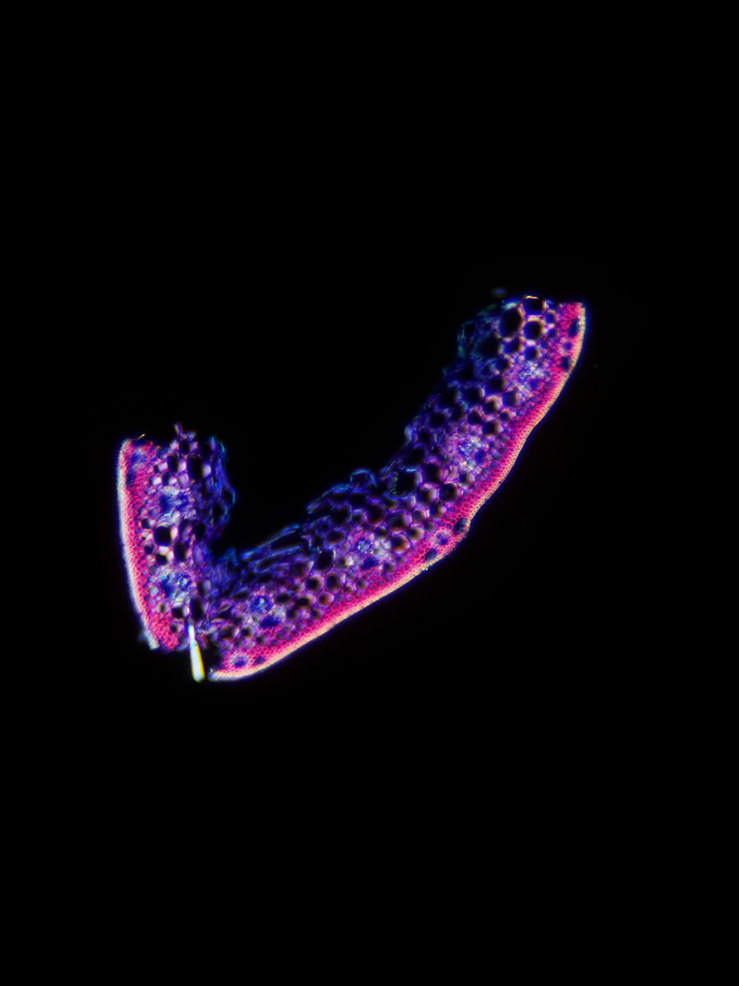 Outline with rips. Upper epidermis cells in one row. Vascular bundles centered between the upper and lower side of the leaf. Girders extending from the vascular bundle to both sides of the leaf.