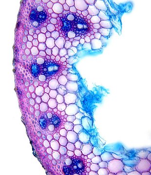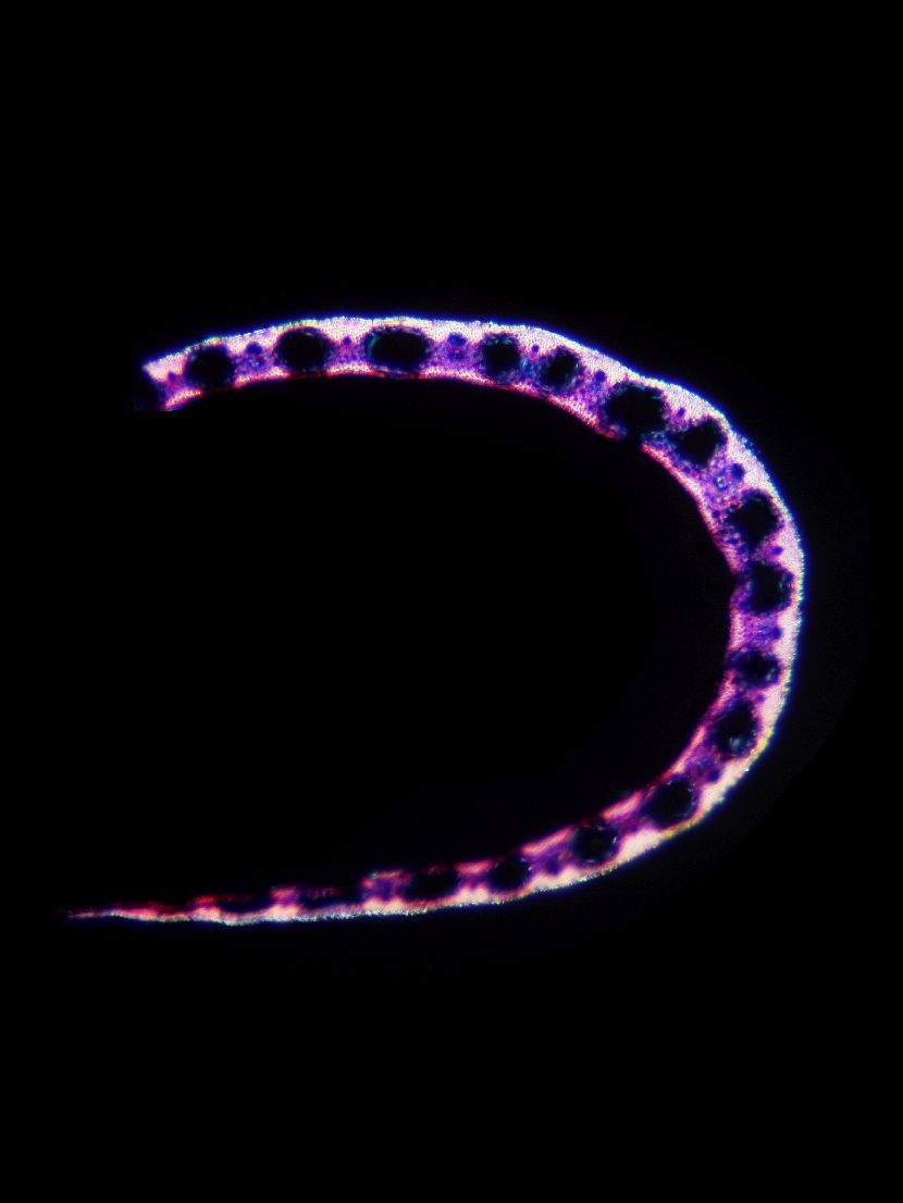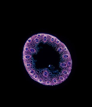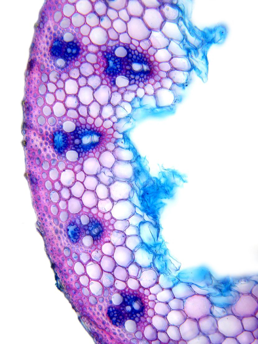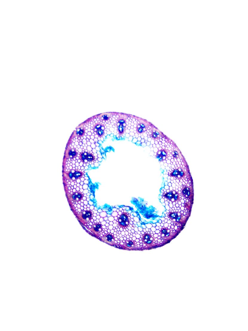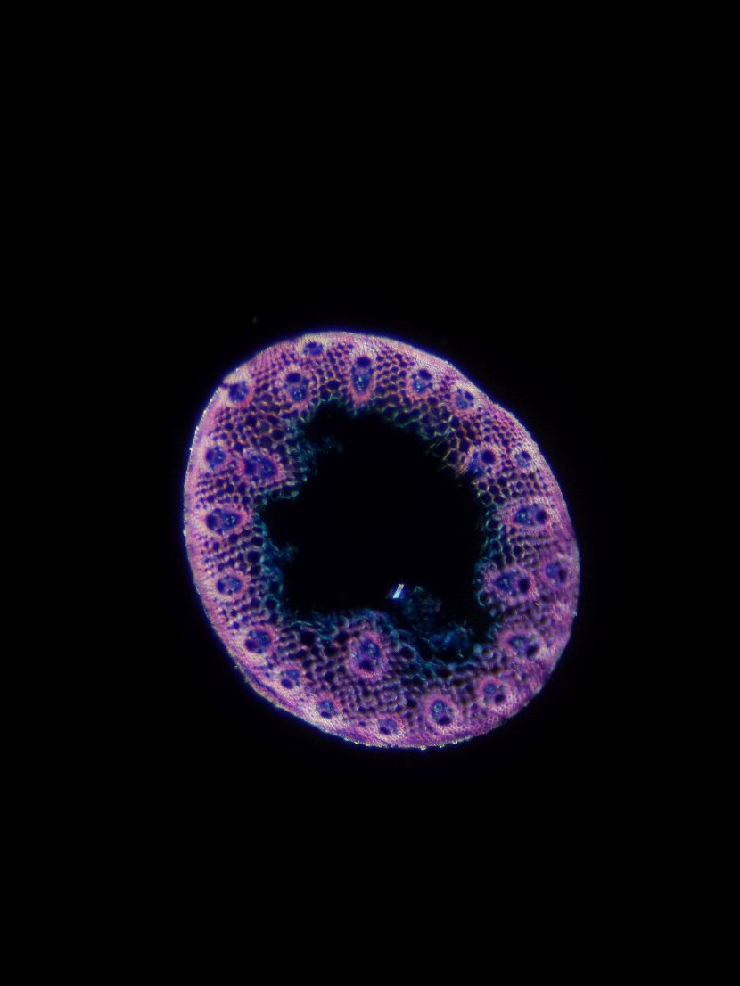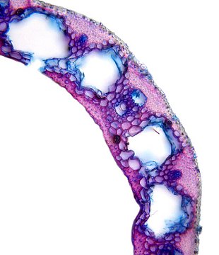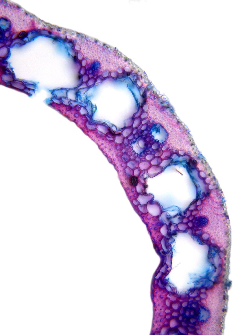 Cross-section round. Outline smooth. Culm center hollow. No visual difference between epidermis cells and sclerenchyma cells. Continuous peripheral sclerenchymatic belt. Large vascular bundles in 2-3 rows. Solitary large vascular bundles. Sclerenchymatic