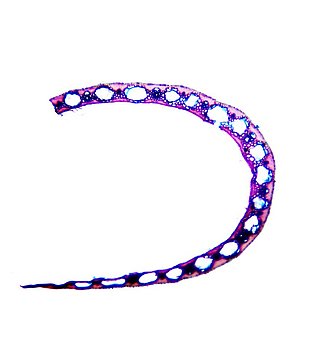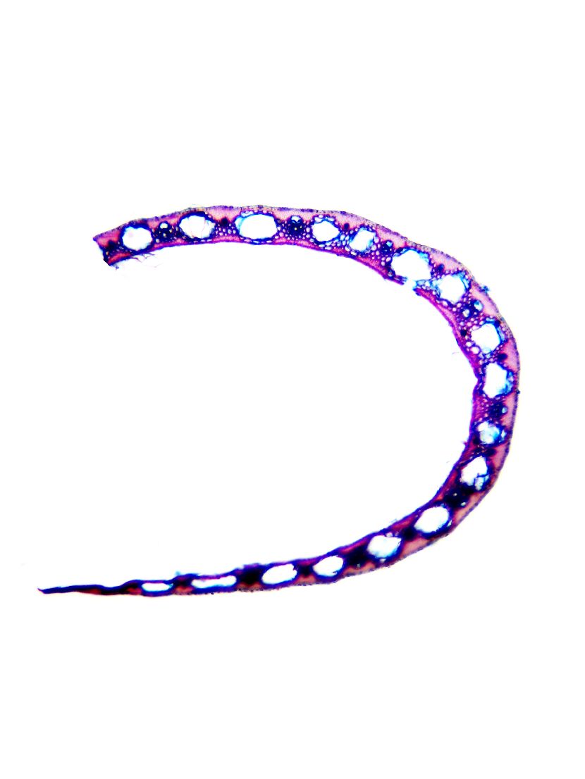 Outline smooth. Upper epidermis cells in one row. Epdermis lignified. Vascular bundles centered between the upper and lower side of the leaf. Girders extending from the vascular bundle to the lower side of the leaf.