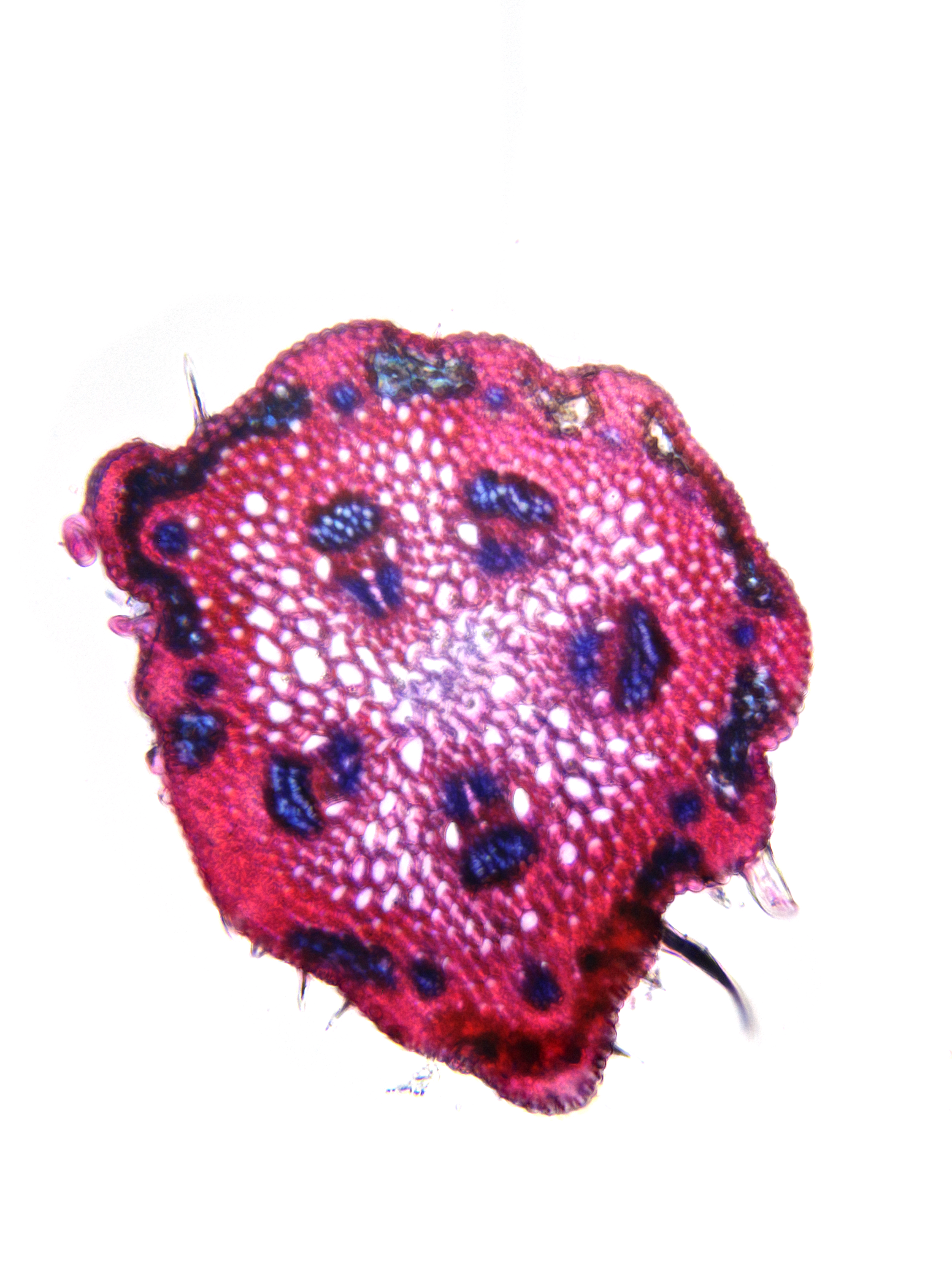 Culm-diameter < 0.5 mm, center full, radius of culm in relation to wall thickness 1:1. Outline circular wavy. Culm-center full, containing lignified cells. Epidermis with hairs. Epidermis-cells thick-walled all around. Large vascular bundles arranged in o