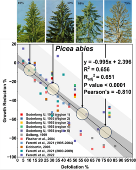 Changes in crown density (popularly termed “defoliation”) can reveal important modifications in tree health and vitality and is a common, though unspecific, forest health indicator adopted in Europe and elsewhere. Here, we leveraged different data and methods to study the development of defoliation on living trees, its main drivers and its expected impact on growth and carbon (C) sequestration.