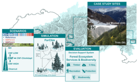 To answer this question, we simulated forest development using the ForClim forest model at two Alpine study sites, together representing a large biogeographic gradient from high-elevation inner Alpine forests (Switzerland) to lower-elevation south-eastern Alpine forests (Slovenia). The simulations considered three climate scenarios (historical climate, SSP2-4.5 and SSP5-8.5) and six alternative management strategies, including both current CNF management practices and climate-adapted versions. Using a indicator based multi-criteria decision analysis framework, we assessed the joint impacts of climate and management on biodiversity and key ecosystem services of the investigated regions, including carbon sequestration (CS) inside and outside the forest ecosystem boundary.