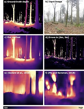 Our proposed model takes forest (360°) RGB-D images as input, where the depth channel is a sparse sampling of the ground-truth depth. For feature extraction, we trained ResNet-18 with a loss function that depends on the L1 depth distance, gradient loss, and normal loss. The model was trained for 120 epochs with an adaptive learning rate with an initial value of 0.1. Our analysis shows that our depth maps are visually the closest to the ground truth and our predictions are highly correlated to the true depth, with an absolute error of 0.89 m for 1000 input samples.