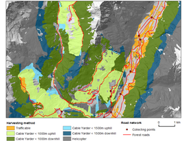In order to evaluate the suitability of the currently applied harvesting techniques, we developed a method to derive the technical feasibility of a variety of potential harvesting techniques. Additionally, we also compared their transportation routes for cost estimations. To identify the technically feasible harvesting techniques we used various wall-to-wall, spatially explicit (topography, forest map), as well as field (NFI plot) data (obstacles for harvesting operations, mean DBH, species composition) and interview data (applied harvesting techniques) from the NFI.
