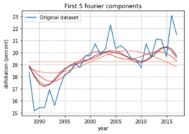 There is increasing interest to identify patterns of current plastic and evolutionary response of plants to climate change. Since plasticity can be reflected by tree health, one possible investigation approach is the analysis of tree health (canopy defoliation) data collected on ca. 6000 plots across Europe since the 1980s and for which a fully convincing evaluation is still missing. We will investigate if changes and trends in defoliation permit to identify species-specific response to climate change, also in view of future adaptation scenarios. We will do it according to novel methods, including Fast Fourier Transforms, selection of candidate variables, grouping of sites, optimal spectra (time window) and offset (time lag) for each variable, and response in relation to predictors within moving windows.