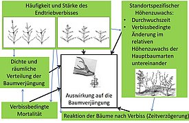 - Höhenzuwachs der Bäumchen und damit i) zur Durchwuchszeit und ii) zu den verbissbedingten Änderungen im Höhenzuwachs der Baumarten untereinander