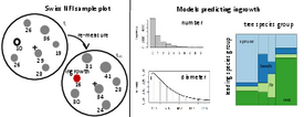 Eine genaue und repräsentative Vorhersage des Zuwachses ist für die Modellierung der Waldentwicklung unerlässlich. Neben der Anzahl der eingewachsenen Bäume sind auch die grundlegenden Baummerkmale Durchmesser und Baumart von Bedeutung. In dieser Studie wurden diese drei Merkmale anhand von Daten des Schweizerischen Landesforstinventars (LFI) modelliert. Die Studie deckte große Gradienten von Bestandsbedingungen und Klimavariablen ab, so dass sich die Modelle zur Vorhersage des Zuwachses unter dem Klimawandel eignen. Da die Anzahl der eingewachsenen Bäume pro Parzelle mehr Nullen enthielt, als für eine Poisson-Verteilung zu erwarten ist, verwendeten wir drei alternative Wahrscheinlichkeitsverteilungen: die null-inflationäre Poisson-Verteilung (ZIP), die negative Binomialverteilung (NB) und die null-inflationäre negative Binomialverteilung (ZINB). Modelle mit jeder der drei Varianten wurden mit und ohne zufällige Effekte angepasst, was zu sechs verschiedenen Modelltypen führte. Die Modellauswahl erfolgte rückwärts anhand des BIC-Kriteriums. Von den endgültigen Modellen zeigte ZIP die beste Vorhersage der unabhängig beobachteten Anzahl eingewachsener Bäume. Unsere Ergebnisse deuten darauf hin, dass die Anzahl der eingewachsenen Bäume stark vom Entwicklungsstadium der Wälder und von der Grundfläche der Bestände abhängt, während Temperatur und Niederschlag, Stickstoffdeposition und Wasserhaltevermögen jeweils einen geringeren, aber immer noch signifikanten und plausiblen Einfluss haben. Zur Beschreibung der Wahrscheinlichkeitsverteilung des Durchmessers der eingewachsenen Bäume wurde die Weibull-Funktion verwendet, und die Parameter wurden mit Hilfe des Likelihood-Ansatzes geschätzt. Th