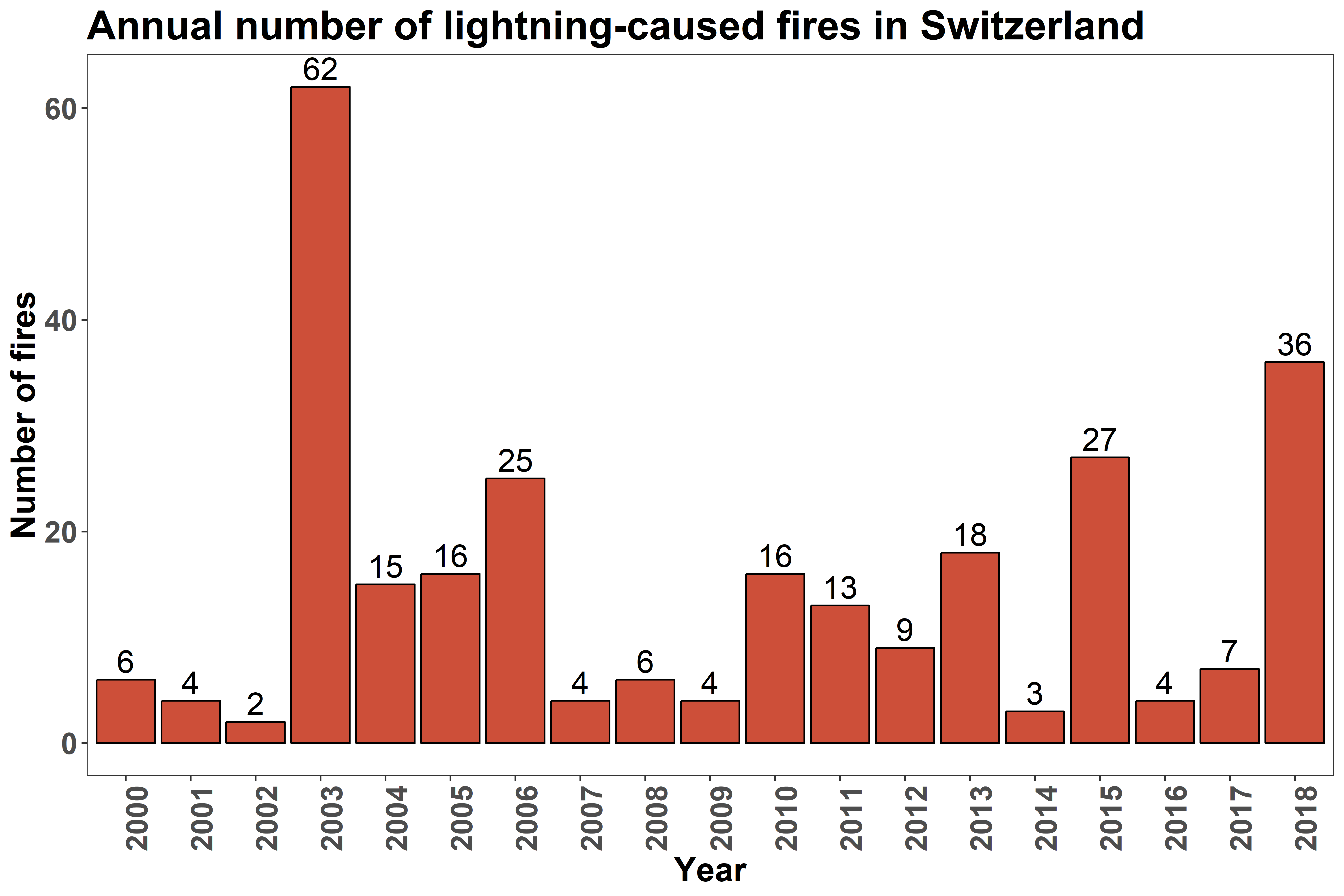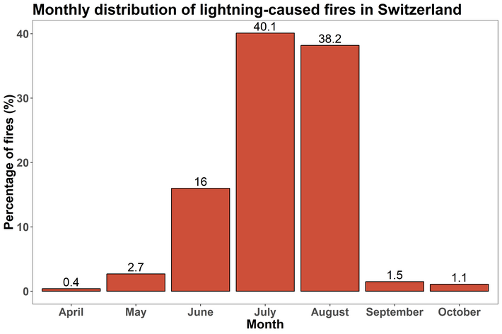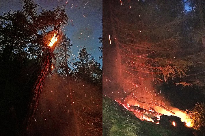 Durch Blitzschlag verursachte Brände haben eine wichtige Rolle in der Dynamik von Waldökosystemen auf der ganzen Welt gespielt, und das tun sie auch heute noch, z.B. in borealen Wäldern. In der Schweiz wurden in den 19 Jahren von 2000 bis 2018 277 durch Blitze verursachte Brände registriert, was 12,5% der Gesamtzahl der Waldbrände und 8% der gesamten verbrannten Fläche entspricht. Blitzinduzierte Brände machen jedoch einen größeren Teil der Sommerwaldbrände aus. So wurden 31% der Brandereignisse und 38% der Brandflächen von Juni bis August im Zeitraum 2000-2018 durch Blitze verursacht. In dem Sommermonaten treten auch die meisten der durch Blitze verursachten Brände auf. Dieses Naturphänomen scheint bei außergewöhnlicher Sommerdürre besonders relevant zu sein, wie die Statistik für die Jahre 2003, 2015 und 2018 in der Schweiz aufzeigt. Für die nächsten Jahrzehnte werden für die Sommermonate (CH2018) höhere Temperaturen und geringere Niederschläge vorhergesagt, und Trockenjahre dürften häufiger auftreten. Dieses Klimaszenario kann das Regime der natürlichen Brände in den Alpen erheblich verändern und die Zahl, die Brandfläche und die Schwere der durch Blitze verursachten Brände erhöhen. Deshalb müssen wir die Muster und Bedingungen, unter denen sich blitzinduzierte Brände entwickeln, besser verstehen.
