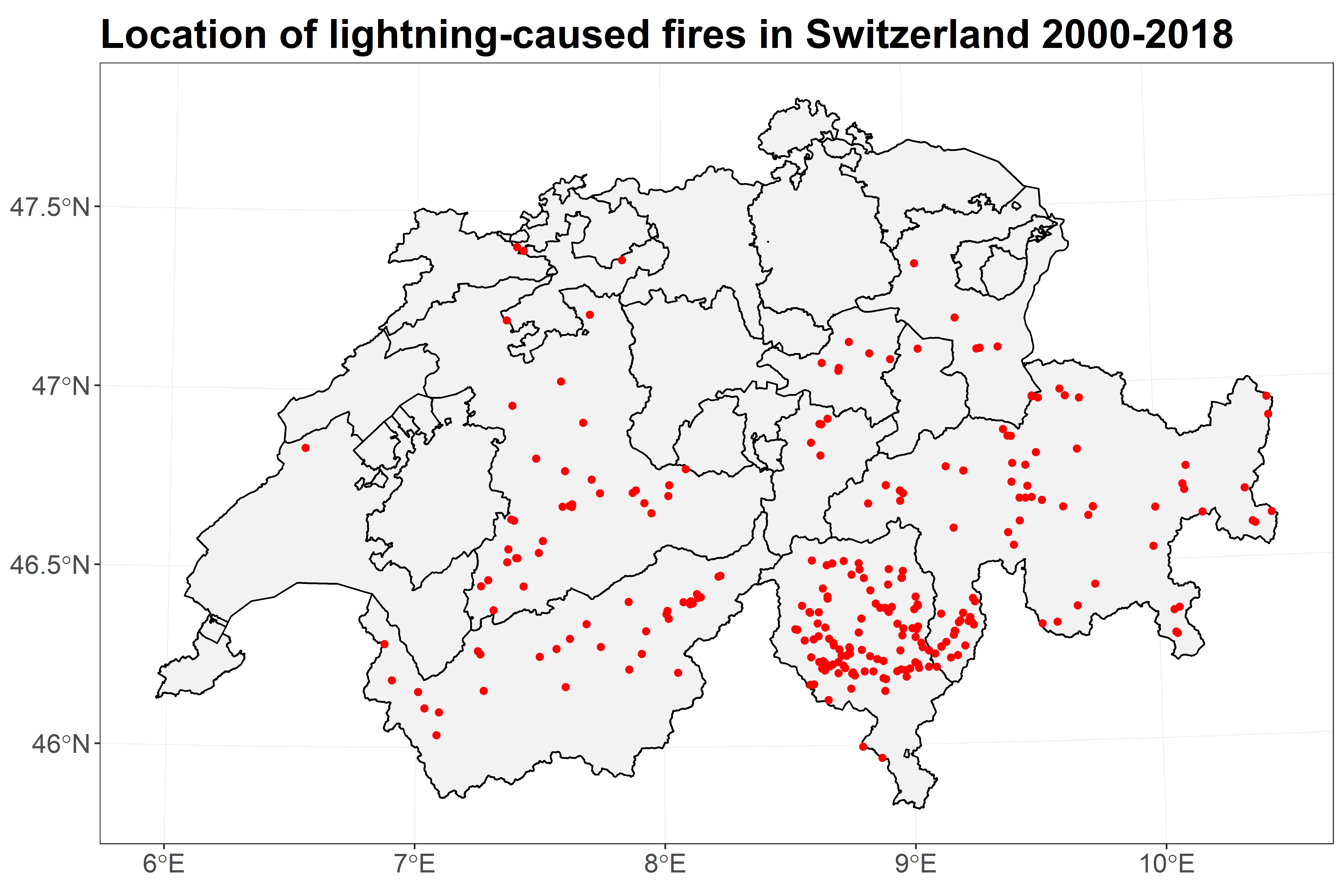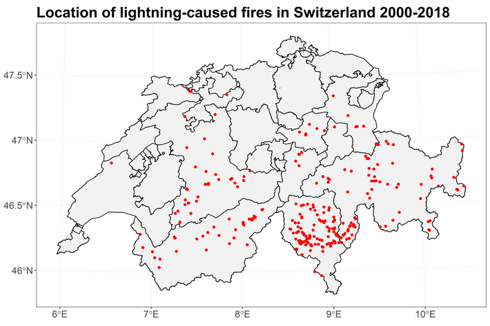 In einem ersten Schritt haben wir die Entstehung von Waldbränden mit und Blitzdaten abgeglichen. MIt anderen Worten: Wir haben haben versucht, den Blitz zu finden, der das Feuer entzündet hat. Dafür haben zwei Datenquellen verwendet. Einerseits haben wir Informationen über natürlich entstandene Waldbrände in der Zeit von 2000-2018 aus der Swissfire-Datenbank. Andererseits haben wir die Blitzdaten für die Schweiz aus der European Cooperation for Lightning Detection Network (EUCLID) gezogen. Den Blitz zu identifizieren, der das Feuer möglicherweise ausgelöst hat, ist keine triviale Aufgabe. Die Genauigkeit der Blitzortung kann zwischen einigen hundert Metern und einigen Kilometern liegen, und einige Brände können mehrere Tage lang als "Überbleibselfeuer" schwelen, bis die Vegetation in Flammen aufgeht. Bisher haben wir verschiedene Vorgehensweisen verglichen und den am ehesten in Frage kommenden Blitz ausgewählt.
