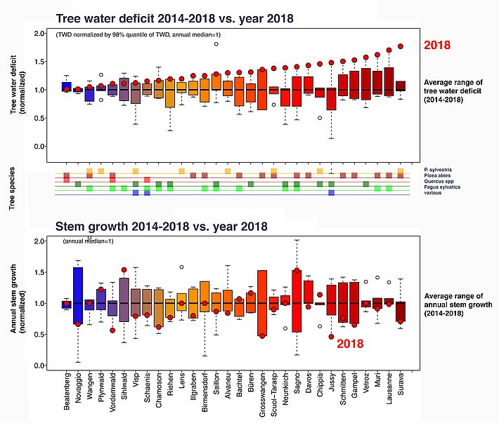 Baumwasserdefizite (TWD) sind ein Indikator für die Menge an fehlendem Wasser eines Baumes (hier dargestellt als normierte Werte). Je grösser das TWD, desto grösser ist auch das Defizit und damit der Trockenstress der Bäume. Die Boxplots zeigen das durchschnittliche TWD während der Wachstumsperiode über fünf Jahre seit 2014 an den Messstandorten von TreeNet. Die roten Punkte zeigen den Wert von 2018. An vielen Standorten übertraf das durchschnittliche TWD des Jahres 2018 die Vorjahre markant.
