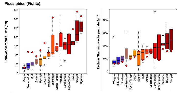 Die Fichte verzeichnete nicht nur durchwegs überdurchschnittlich hohe Baumwasserdefizite (TWD) während der Wachstumsperiode im 2018, sondern wuchs auch fast ausnahmslos schlecht. Die farbigen Boxplots zeigen das mittlere jährliche Wachstum mit dem schwarzen Median-Balken (gleich viele Werte oberhalb und unterhalb des Balkens). Die roten Punkte kennzeichnen das Jahr 2018. Interessant ist die Abweichung des roten Punktes vom jeweiligen Median.