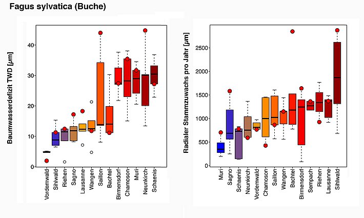 Die Buche reagierte je nach Standort und Bedingung innerhalb eines enorm grossen Bereichs auf das trockene Jahr 2018. Sowohl beim Baumwasserdefizit (TWD) als auch beim radialen Stammwachstum (GRO) gab es grosse und kleine Ausschläge nach unten und oben. Hatte die Buche genügend Wasser im Boden zur Verfügung, konnte sie wie am Bachtel oder im Sihlwald mit sehr grossen Zuwächsen reagieren. Lief sie aber trocken wie in Saillon oder in Neunkirch brachen auch bei ihr die Stammzuwächse ein. Die farbigen Boxplots zeigen das mittlere Wachstum mit dem schwarzen Median-Balken (gleich viele Werte oberhalb und unterhalb des Balkens). Die roten Punkte kennzeichnen das Jahr 2018. Interessant ist vor allem die Abweichung des roten Punktes vom jeweiligen Median.