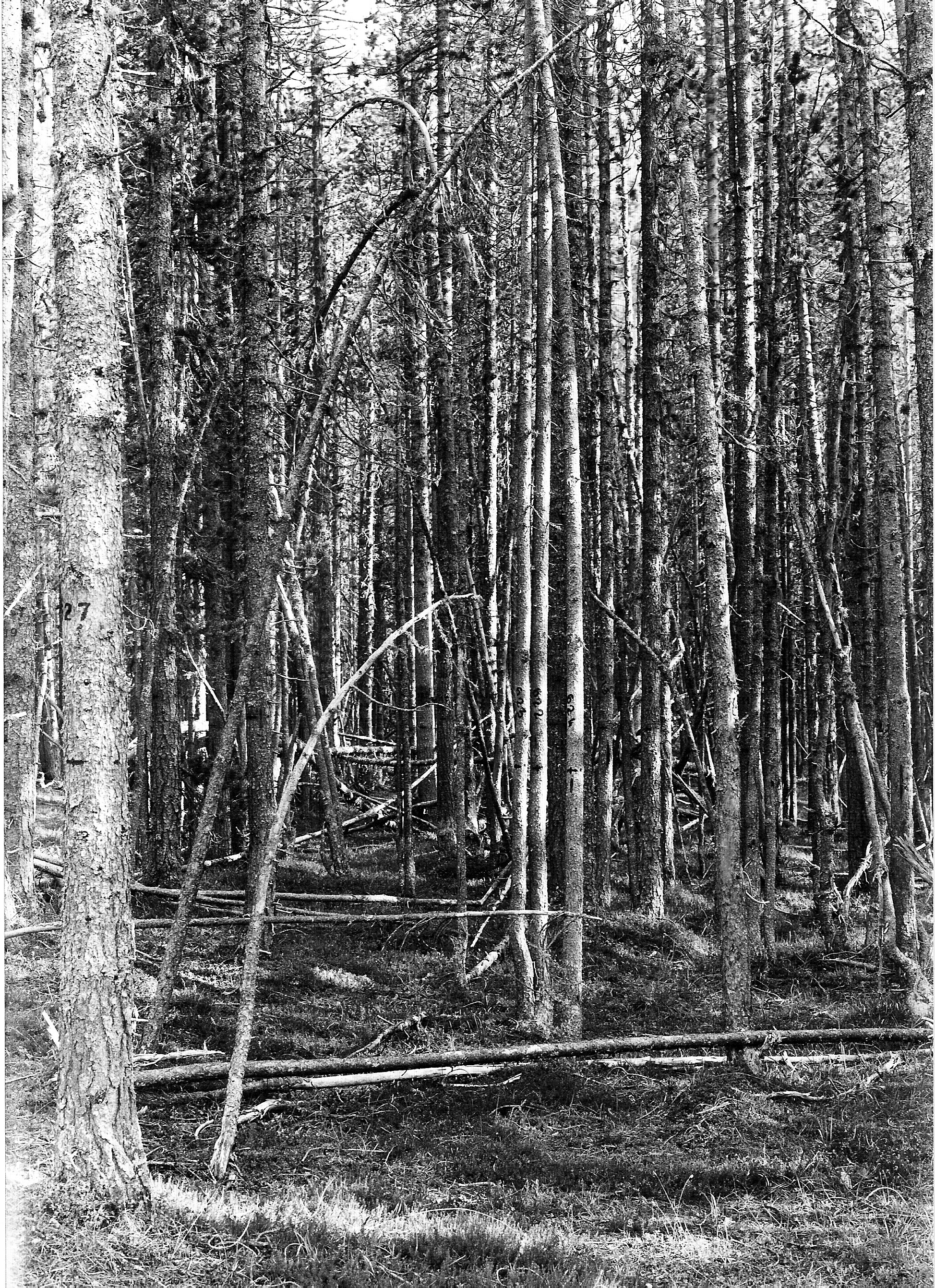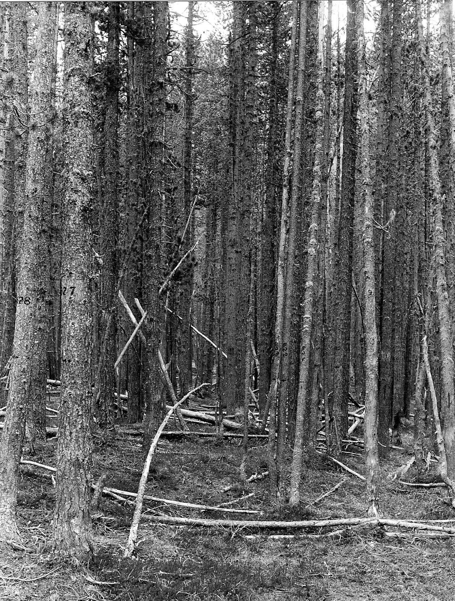 Diese Fotoserie zeigt als Beispiel die Entwicklung der Ertragskunde-Fläche in Stabelchod (Fläche 05004000). Auf der Fläche wächst Pinus mugo und einige nachwachsende Pinus cembra. Die Fotos zeigen, dass die Fläche sich von relativ dichtem Wuchs durch Selbstausdünnung genügend geöffnet hat, um Verjünung zu erlauben.