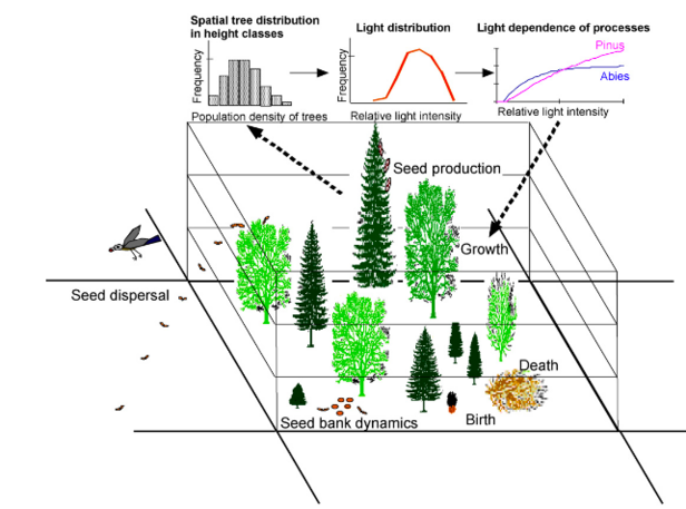 TreeMig - schon mal davon gehört? TreeMig ist ein dynamisches Waldmodell auf Landschaftsebene, das an der WSL entwickelt und eingesetzt wird. Es simuliert, wie sich verschiedene Baumarten in der Schweiz (und darüber hinaus) unter Berücksichtigung von Klima, Samenausbreitung und Konkurrenzdruck entwickeln und verbreiten. TreeMig eignet sich daher zur Modellierung einer Vielzahl von wichtigen Waldeigenschaften wie BA, LAI oder Stammzahlen im Zusammenhang mit dem Klimawandel, vom Bestand bis hin zum ganzen Land. Es kann mit auch mit Szenarien für Störungen, Management, Landnutzungsänderungen oder auch invasiven Arten ergänzt werden.