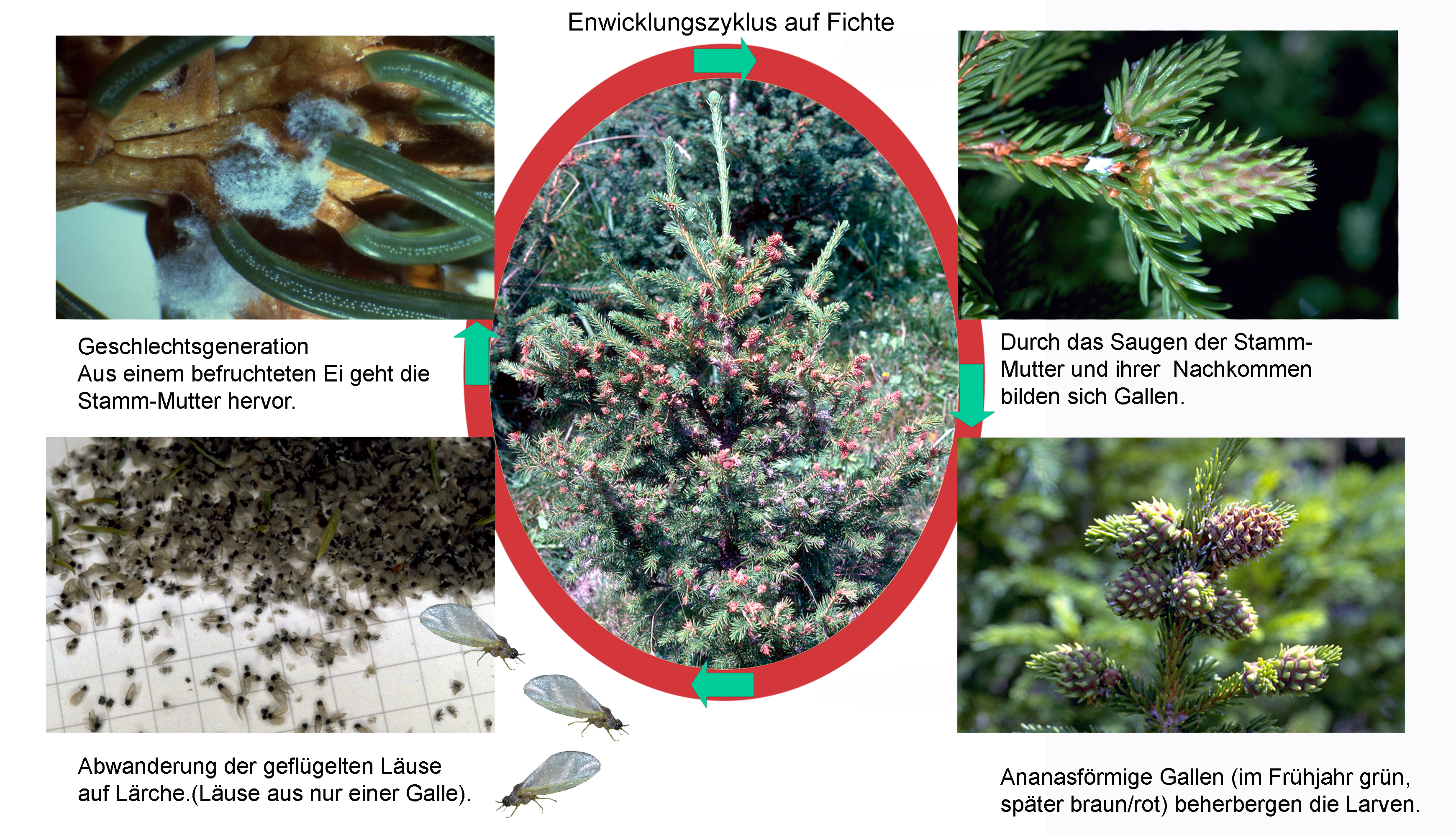 Die Gallenläuse sind Pflanzensaftsauger und benötigen zwei Jahre, um ihren Lebenszyklus komplett zu durchlaufen. Dabei können die Läuse von Fichte auf die Lärche wechseln und kehren nach einer gewissen Zeit auf die Fichte zurück.