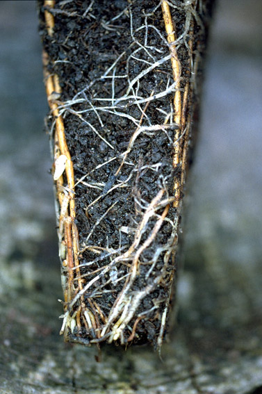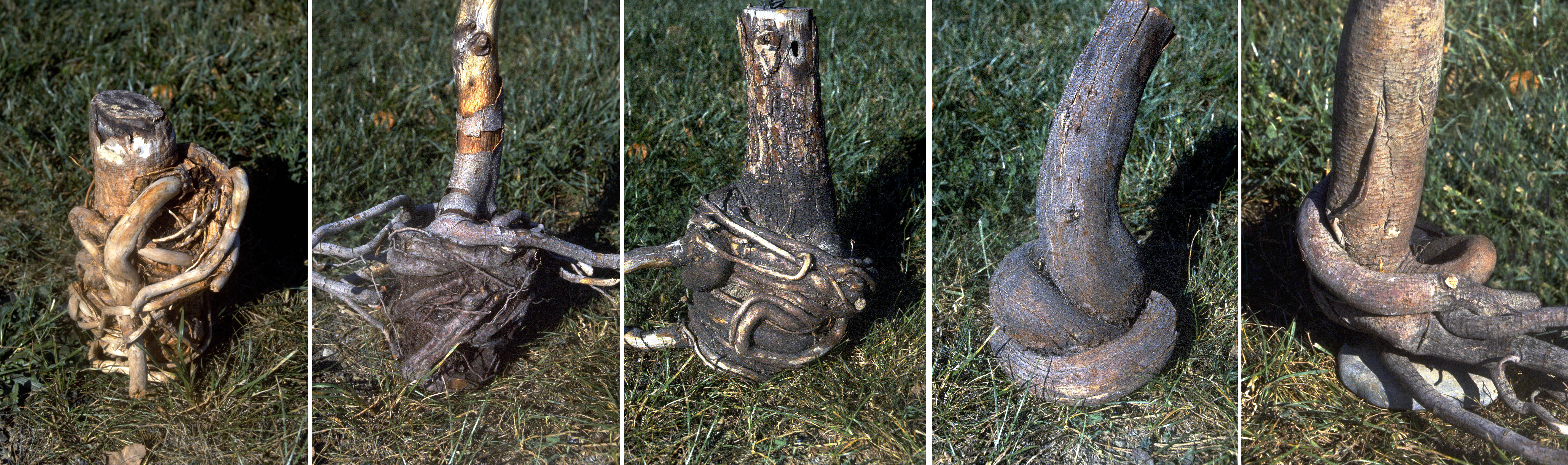 Ein Drehen der Wurzeln im Topfinneren, wie z.B. bei Blumen in runden Tontöpfen, kann für Forstpflanzen fatale Folgen haben. In vielen Fällen konnten wir beobachten, dass die Bäume schon nach wenigen Jahren einen gedrehten Wurzelknäuel entwickelt haben. Die Wurzel schnüren sich so selber langsam gegenseitig ab. Auch wenn der hemmende Topf schon lange entfernt wurde oder sich zersetzt hat, findet der Baum nicht zu einem natürlichen standfesten Wurzelwerk zurück.