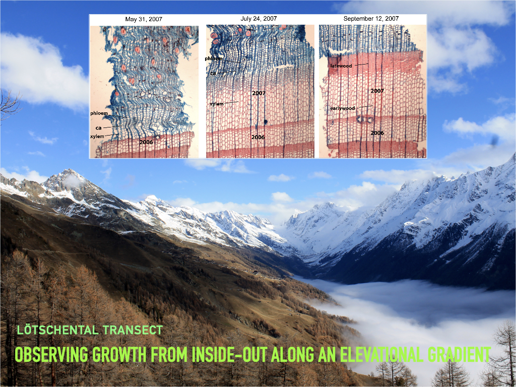 Für die Schweiz sagen Klimaforscher für die nächsten 100 Jahre einen Temperaturanstieg von etwa 3°C vorher. Dies entspricht dem heutigen Temperaturunterschied zwischen der Baumgrenze und dem Talboden und macht das Lötschental zu einem idealen Untersuchungsgebiet für Effekte des Klimawandels. Deshalb beobachten wir seit 2011 über die Jahrringe das Wachstum zweier ökologisch unterschiedlicher Arten, Fichte und Lärche, entlang der Talhänge.