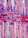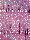 Morphology Z, 30-50 cm Ecology subalpine forest Chorology Rocky Mountains Xylem Distinct rings, ring porous, earlywood vessels solitary, simple perforations, vessel diameter 150 - 200µm, with helical thickenings, apotracheal parenchyma, ray width 1-3 cells, prismatic crystals present. Xylem-Code Phloem Tangential layers of sieve tubes and parenchyma cells, of sclerenchymatic groups in tangential bands, prismatic crystals present. Explanations For explanations please see the Feature Characteristics. | Cross section Tangential section Radial section Bark | |