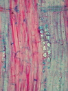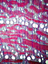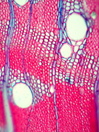 Morphology P, 5-10m Ecology shrub desert cultivated Chorology SW- North America Xylem Distinct rings, ring porous, vessels solitary and in short radial multiples, simple perforations, vessel pits vestured, vessel diameter >100µm, fibers thick-walled, parenchyma aliform and confluent, ray width 1-3 cells, homocellular, procument cells, prismatic crystals present, Xylem-Code Phloem Without sieve tube groups, tangential layers of collapsed sieve tubes, tangential rows of sclerenchymatic groups, prismatic crystals present. Explanations For explanations please see the Feature Characteristics. | Cross section Tangential section Radial section Bark | |