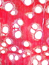 Morphology P, 5-10m Ecology thermophile zone cultivated Chorology Aistralia Xylem Indistinct rings, sometimes ring ring porous, vessels solitary and in short radial multiples, simple perforations, vessel pits vestured, vessel diameter >100µm, fibers thick-walled, parenchyma aliform and confluent, ray width 1-3 cells, homocellular, procument cells, prismatic crystals present, Xylem-Code Phloem Slide missing Explanations For explanations please see the Feature Characteristics. | Cross section Tangential section Radial section | |