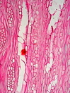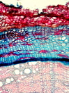 Morphology c 20-40 cm Ecology hill and mountain pinus sylvestris forest Chorology European Xylem Distinct rings, semi-ring-porous, vessels diagonal patterns, simple perforations, vessel diameter 30 – 50µm, with helical thickenings, with vestured intervessel pits, fibers thick-walled, parenchyma vasicentric and terminal, ray width 2-3 (4) cells, homocellular with procumbent cells. Xylem-Code Phloem With ray dilatations, small strips of tangential sclerenchyma cells (missing ins slow growing individuals). Explanations For explanations please see the Feature Characteristics. | Cross section Tangential section Radial section Bark | |
