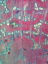 Morphology Z, 30-50 cm Ecology hill and mountain meadow Chorology SW-european Xylem Distinct rings, semi-ring-porous, vessels dendritic patterns, simple perforations, vessel diameter 30 – 60µm, with helical thickenings, with vestured intervessel pits, fibers thick-walled, parenchyma vasicentric and terminal, ray width 3-6 cells, hetero cellular with 1-2 square and upright cells. Xylem-Code Phloem With ray dilatations, tangential blocks of sclerenchyma cells. Explanations For explanations please see the Feature Characteristics. | Cross section Tangential section Radial section Bark | |